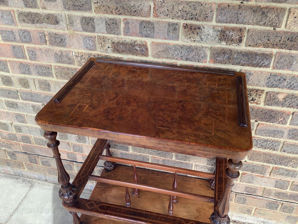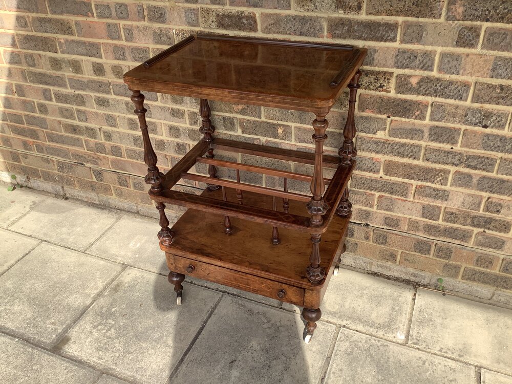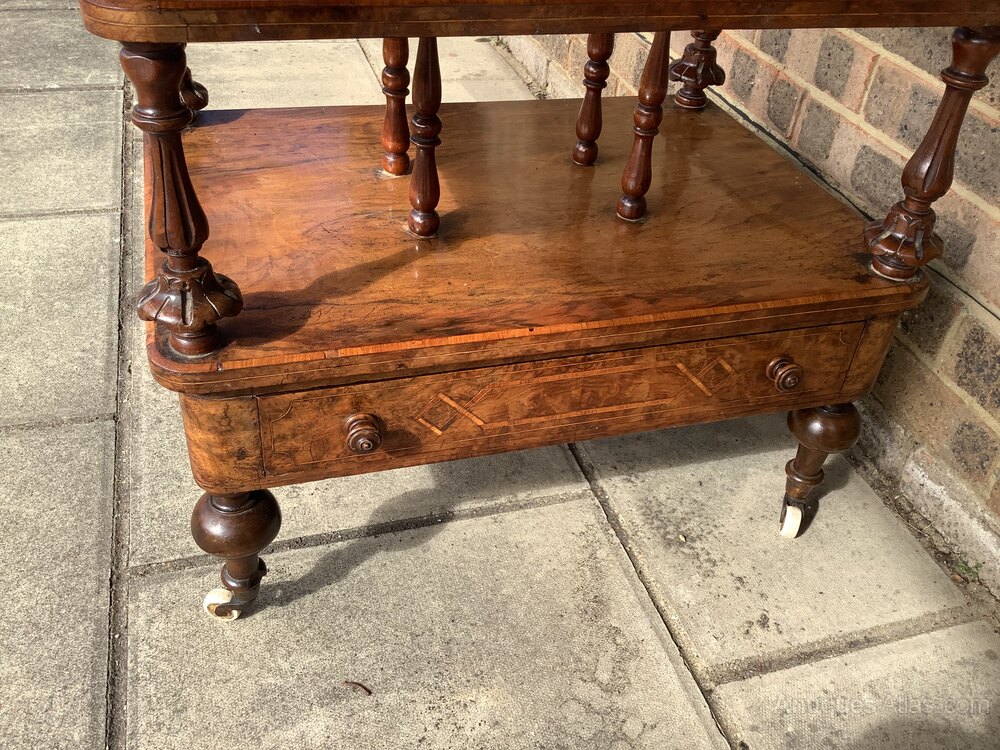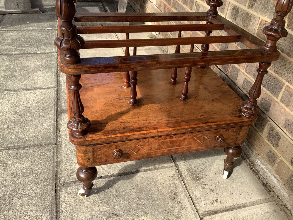 Superb burr walnut canterbury whatnot, has had professional veneer work done to the top plate, to bring it back to an acceptable condition. Mag/Music sheet stowage to the base with single long drawer, turned and reeded upright columns with box stringing all around. Stands on turned base legs with white ceramic castors.