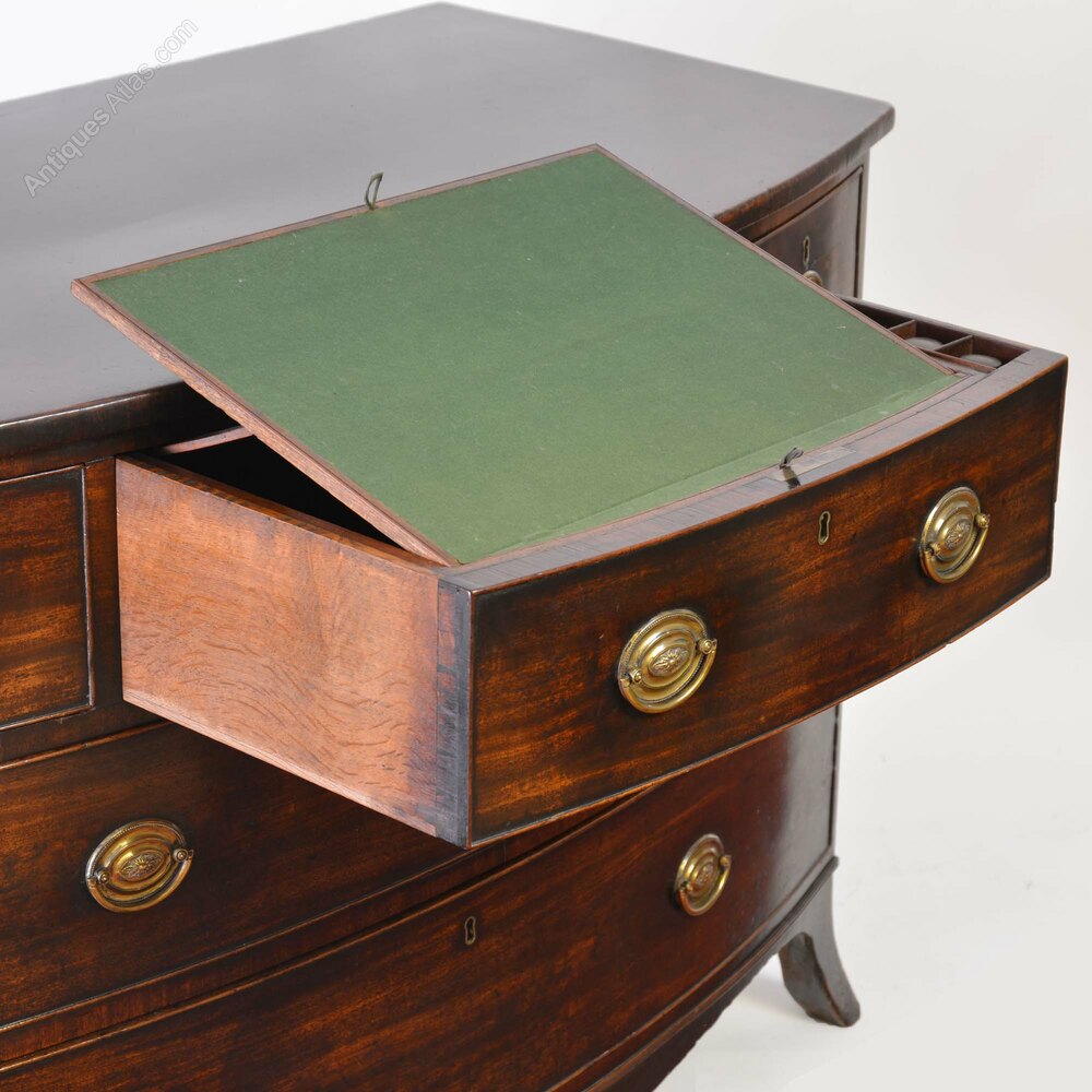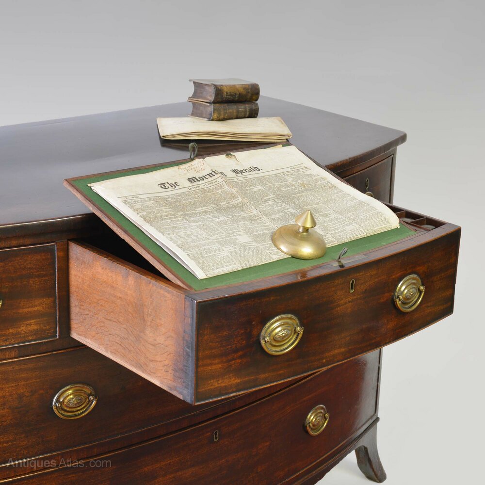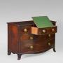 A fine George III mahogany bowfront chest of drawers in well-figured Cuban mahogany. Of large scale, low 3 drawer proportions and swept feet, all in the French commode style, united by a frieze of serpentine form. The drawers all with cockbeading and with original brass oval plate handles. The central drawer opens to a writing slide, which is adjustable with a ratchet, a pen tray and pair of ink pots.