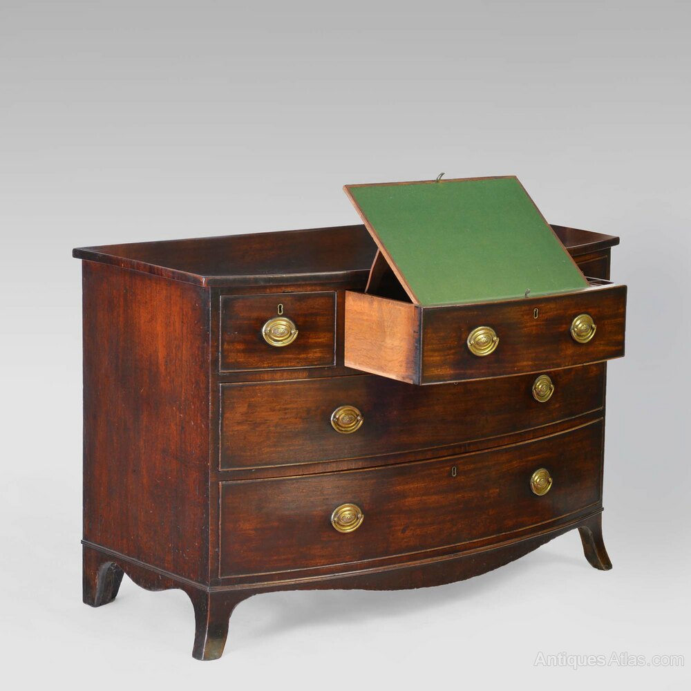 The low height by design so that the writing slide is an accessible height when seated, a variation on both the bachelor's chest and the secretaire. Of elegant bowfront form, the mahogany exhibiting a rich colour and patination.
