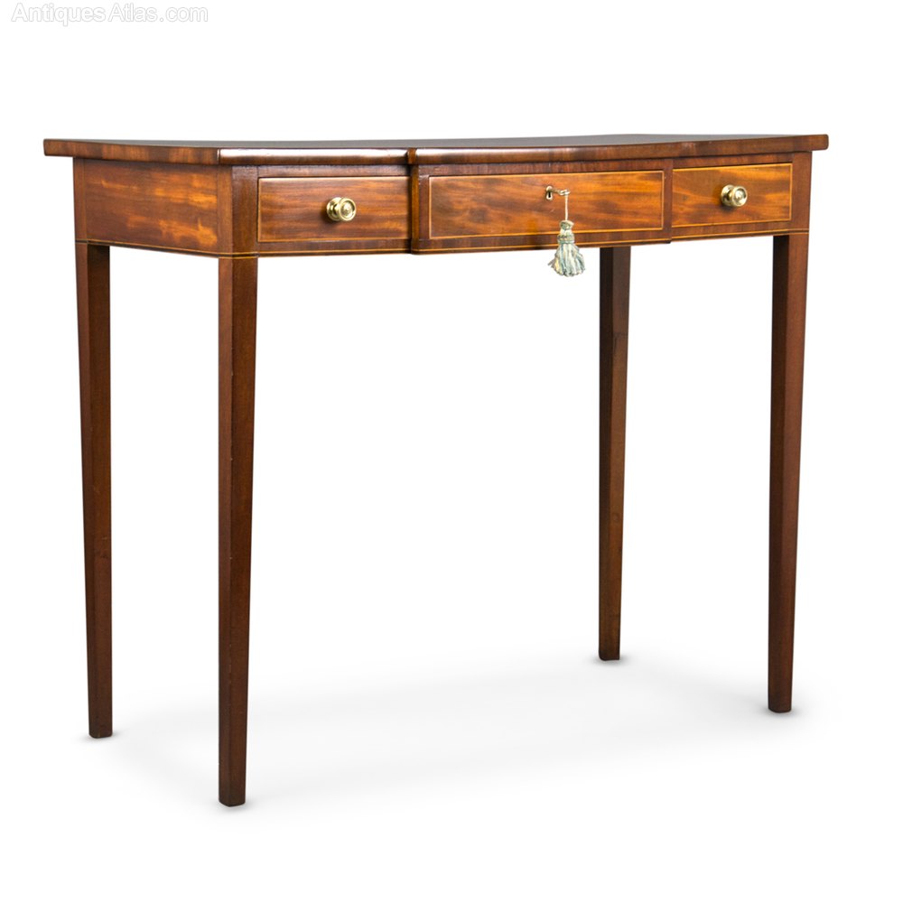 A delightful and fine quality late Georgian period side or hall table of break front form, in particularly attractively grained mahogany, of a rich and warm lustre and patina. The table has three oak lined frieze drawers with boxwood line inlay, the centre one opening on a key and flanked by two with period brass knob handles, and is raised on elegant square section tapering legs.