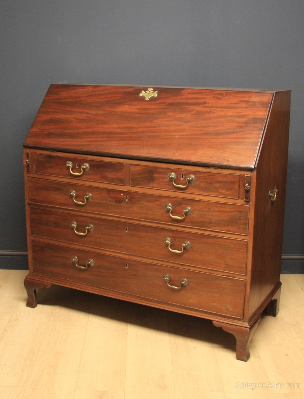 Good quality George III mahogany bureau having figured fall front that opens to reveal writing surface and small drawers and pigeons holes over 2 short over 3 long graduated drawers with swan neck brass handles all standing on ogee bracket feet.