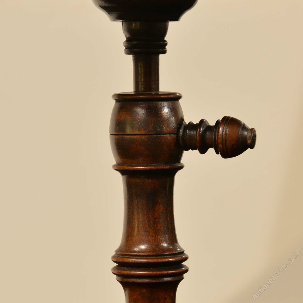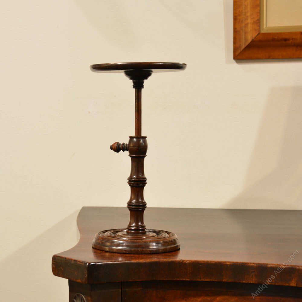 The circular, dished top to an adjustable turned and knopped stem with turned thumb screw, to a finely turned, weighted base. Stand can be adjusted to alter the height of the light from a candlestick placed on top. Of fine colour and patination.