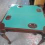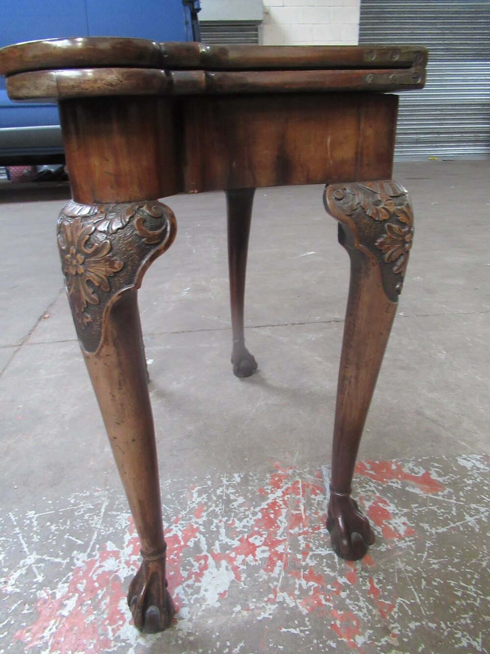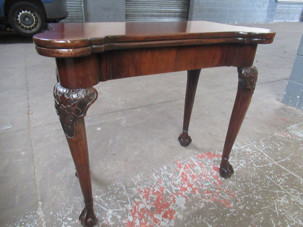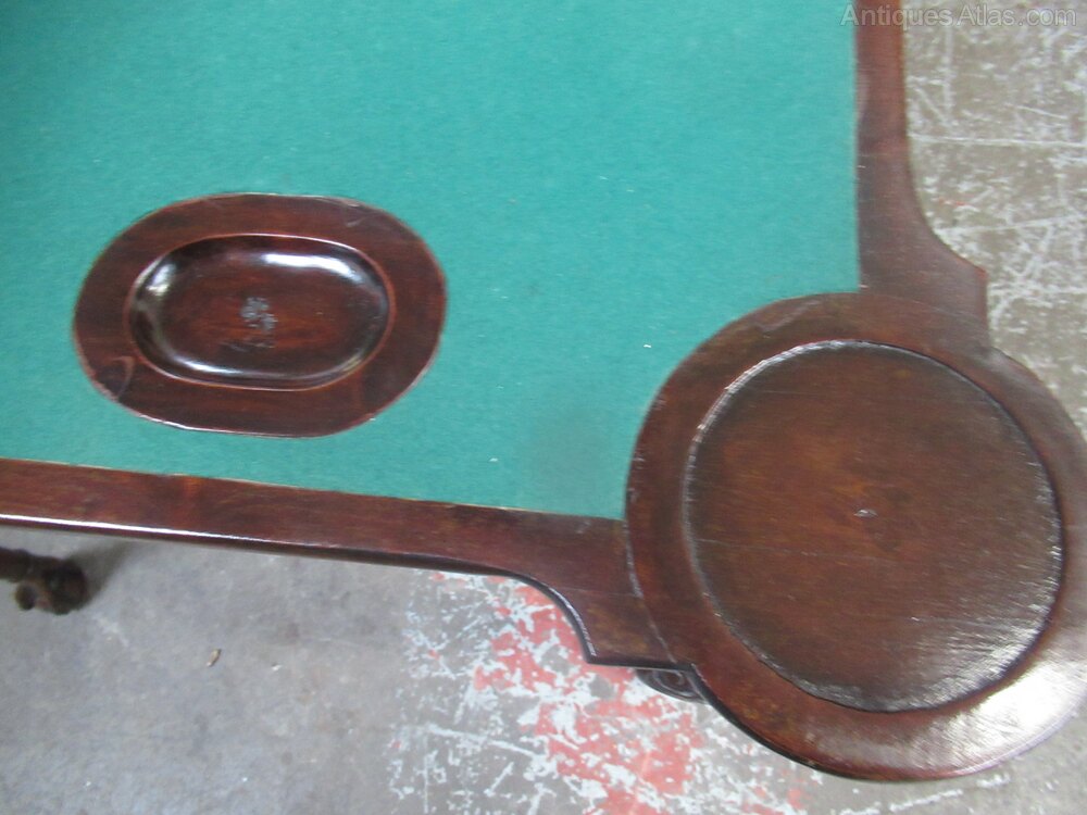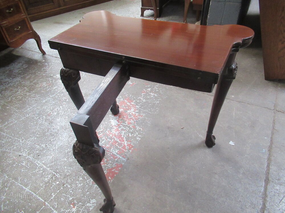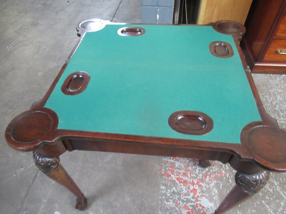 Antique Georgian mahogany card / side table , the table has a shaped top with rounded front corners , The table stands on four cabriole carved legs . The top leaf folds over to form a card table , by a swing out rear leg support, It has a green baise liner , with mahogany dish shaped recess for counters, dating from around 1770s