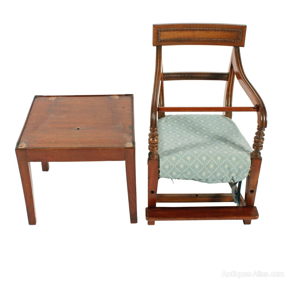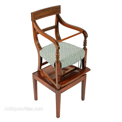 The high chair is made in two parts, a miniature arm chair to the top and a stand/table below.