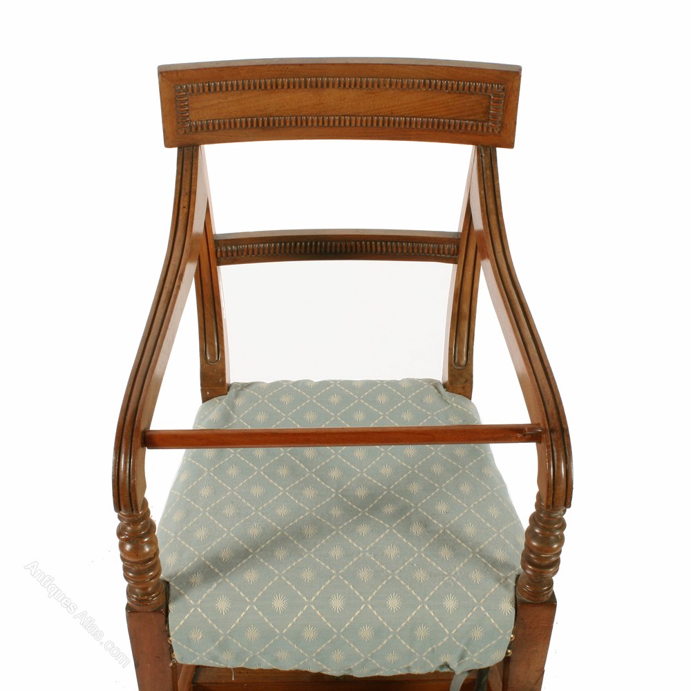 The arm chair is a true model of a Georgian chair with a concave top rail and cross rail that has carved decoration, reeded arms and square tapering legs with cross stretchers.