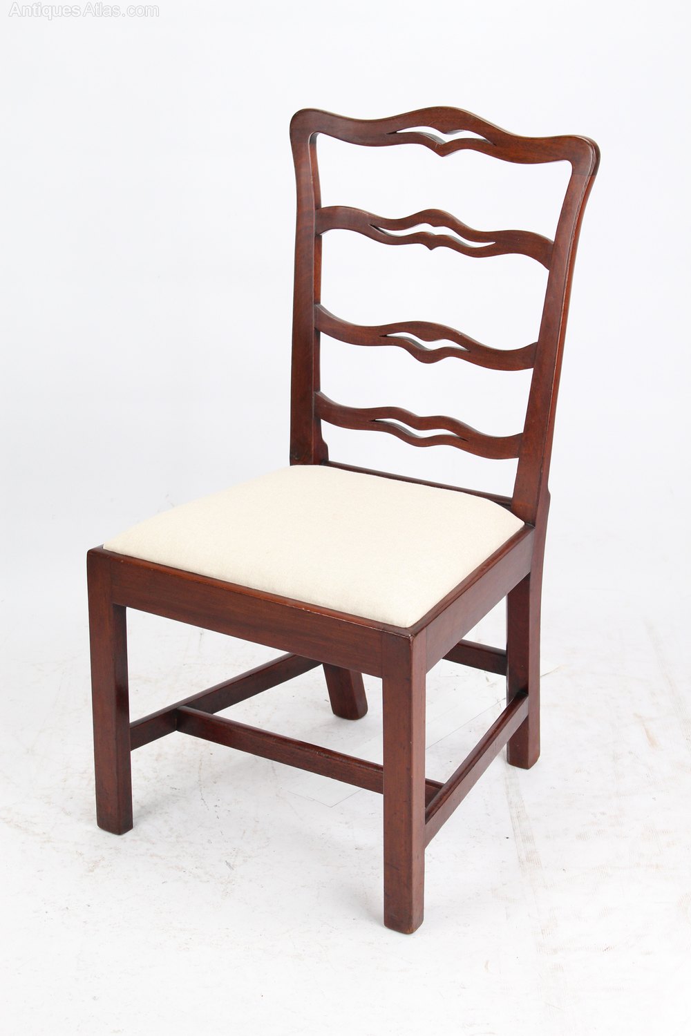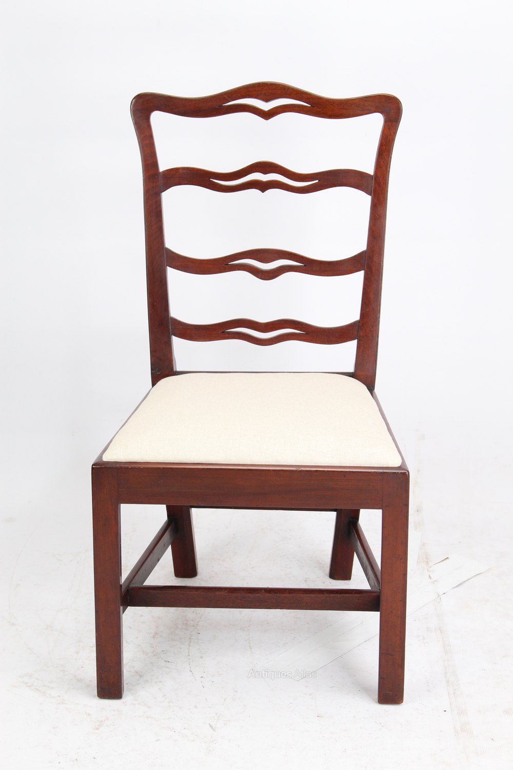 A substantial antique George III mahogany ladder back chair, with drop in seat and raised on tapered legs united by cross stretchers. Solid and sturdy and in good condition with good warm patina. The drop in seat has been newly recovered, would make a great desk chair.
