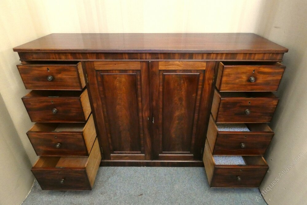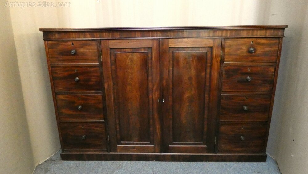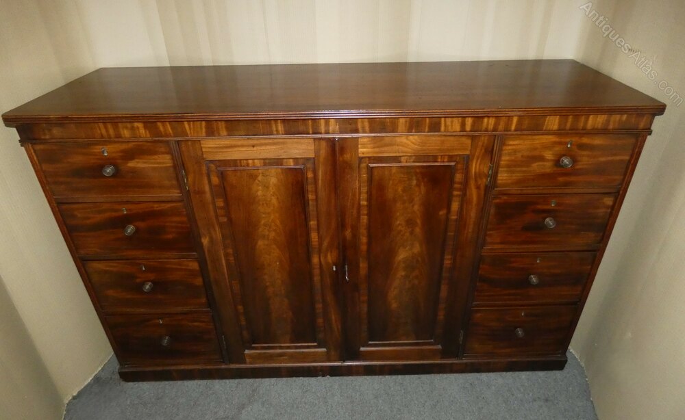 The two crossbanded, panelled cupboard doors opening to an interior fitted with three pull out sliding trays and flanked by four drawers on either side, raised on a plinth base.