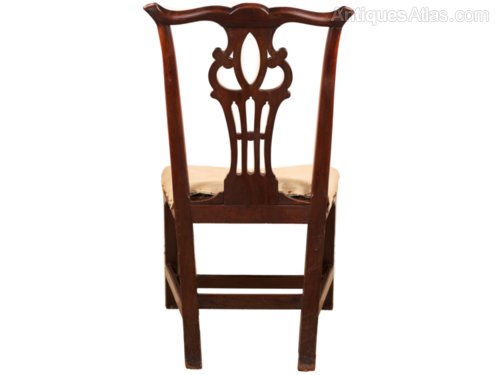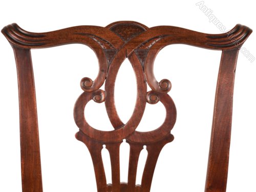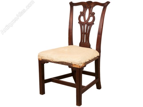 A handsome chair with pierced, carved and punchwork decorated back in Chippendale style. The front legs have a nice detail with the addition of shaped spandrels or corner brackets.