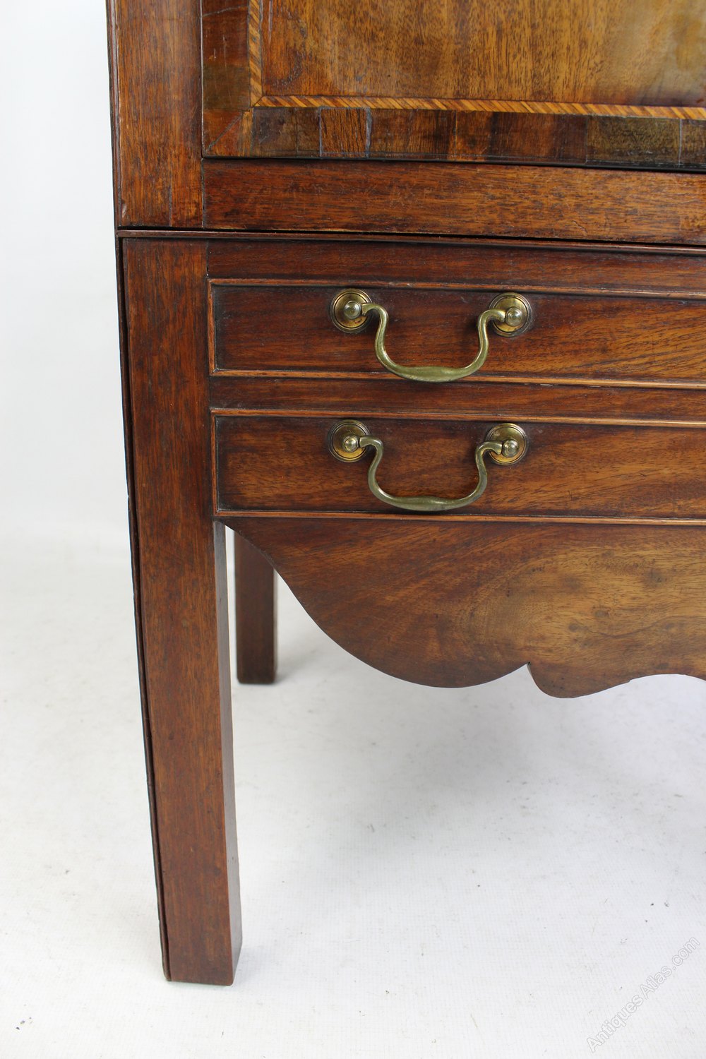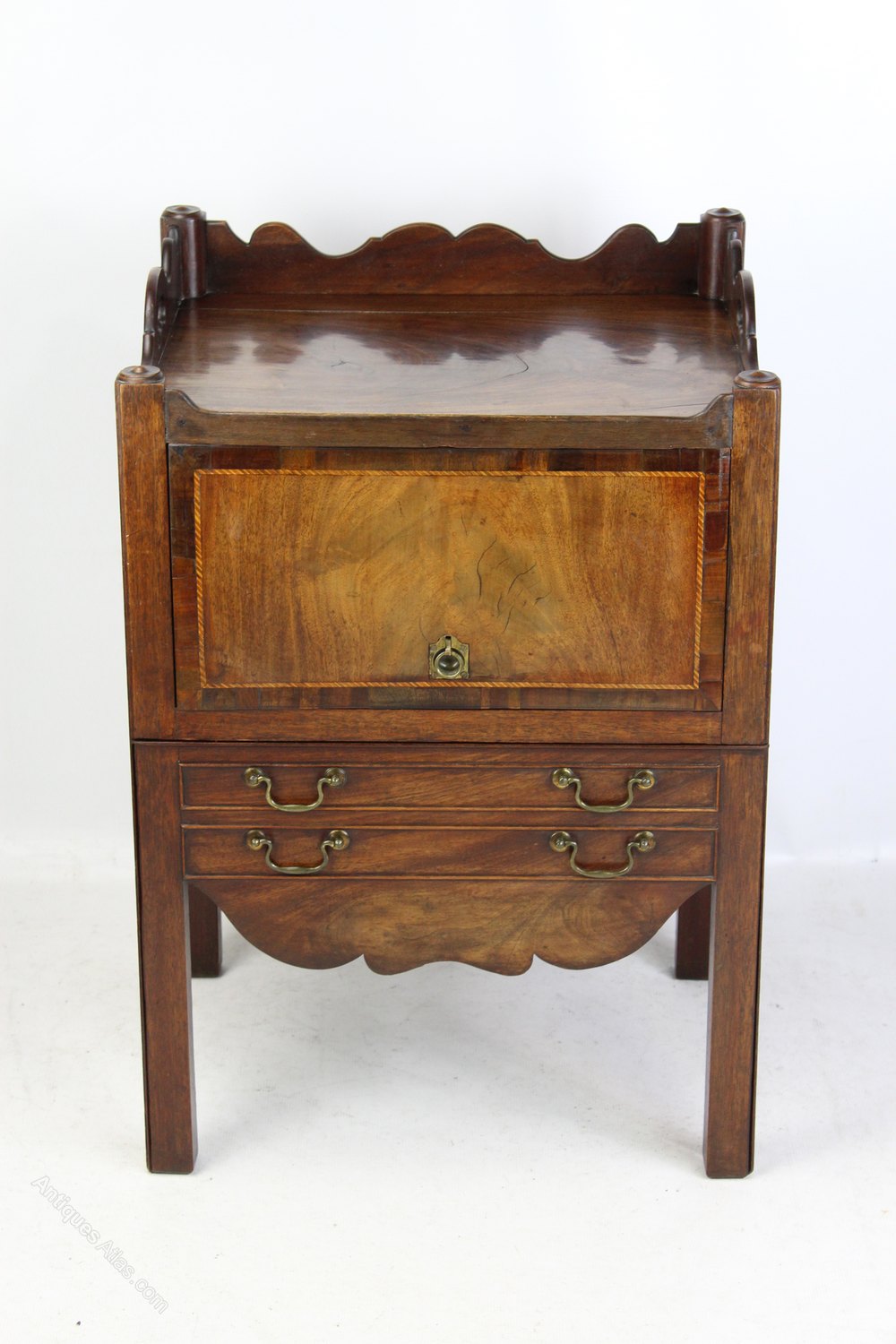 A particularly handsome antique George III mahogany tray top side cabinet or night stand dating from circa 1790. With mahogany banding and ebony and boxwood stringing to front and a galleried tray top with pierced carry handles. With a cupboard over a single drawer with attractive swan neck brass drop handles. It has beautifully figured mahogany to the front and top with very good colour and patina and stands on square feet. This piece would have originally started life as a commode / chamber pot cupboard and has been converted into a side cabinet at some point. A high quality piece it would make a lovely bedside cabinet, hall cupboard or TV unit.