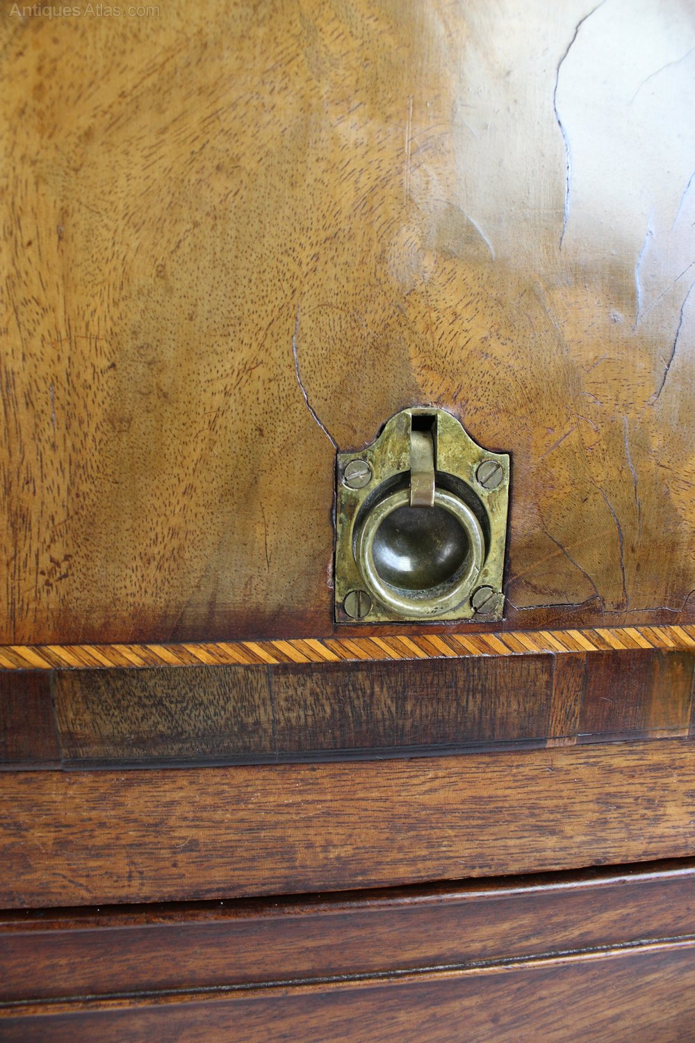 Good colour and patina. Small mends to veneers in places. Other general wear and marks commensurate with age. The cabinet door needs a little push to close it back into place when dropped down (not loose).