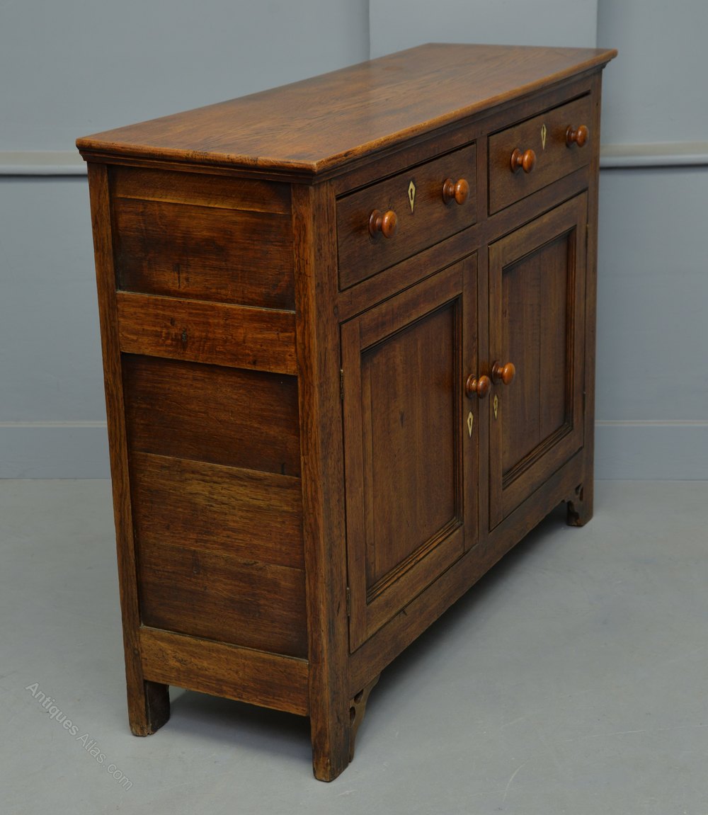 The single plank top has a protruding moulded edge, over two pine lined drawers, with turned bun handles and bone lozenge escutcheons, with the original lock.