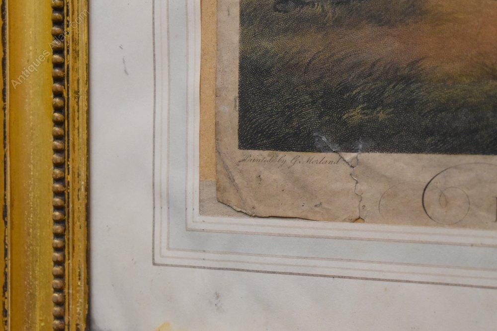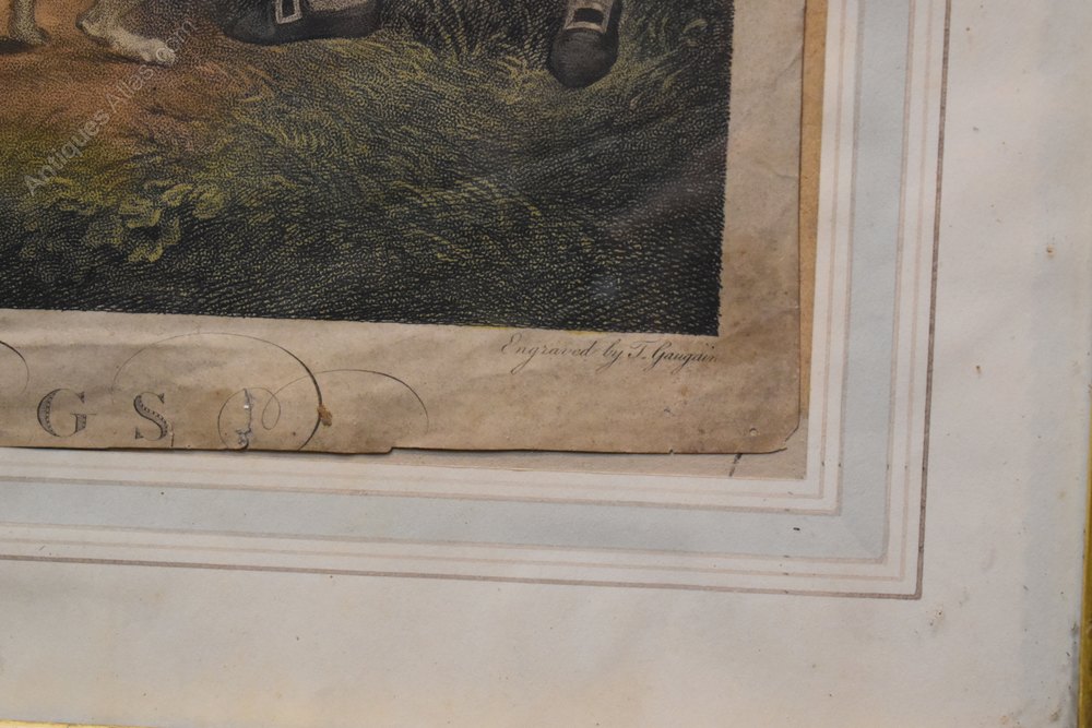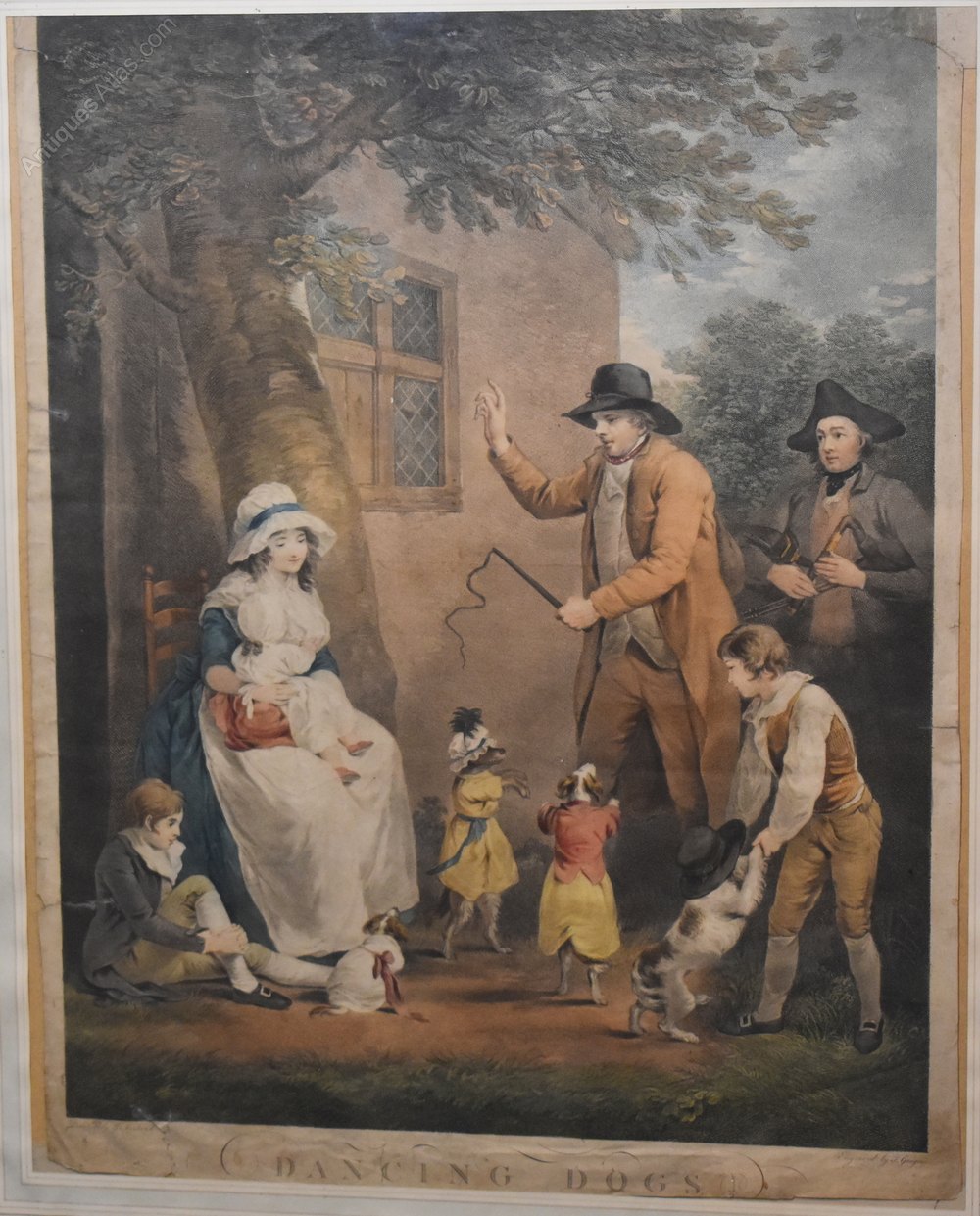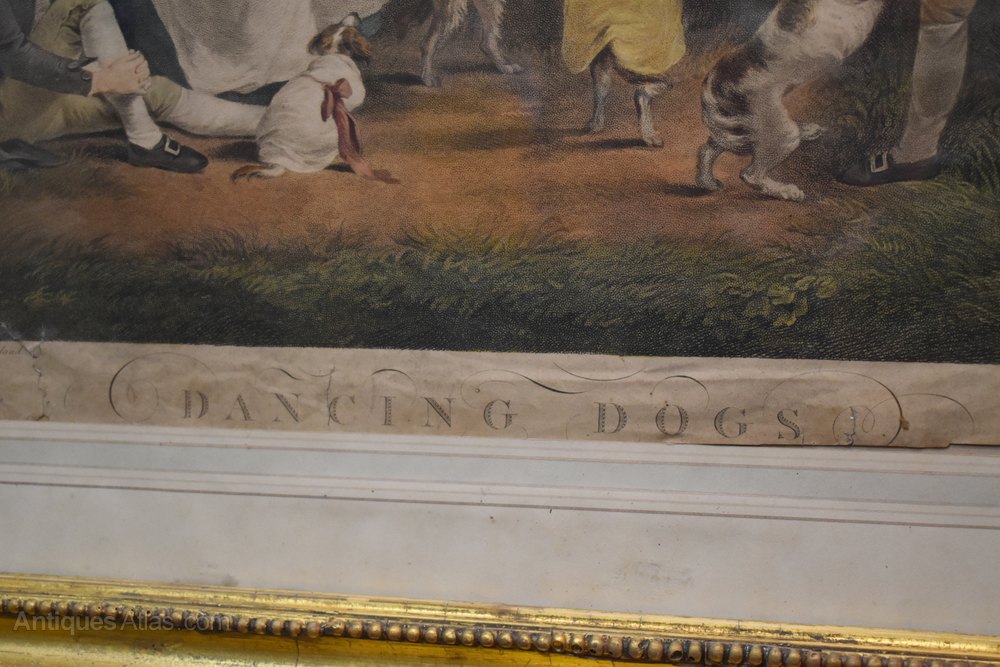 A fine Georgian period stipple engraving titled Dancing Dogs. The print is engraved by T Gaugain after the original painting by George Morland and was published around 1790. The print has some condition issues around the edges with tears but the colours are bright and clear. The frame is a later nineteenth century one from when the print would have been reframed, it is in good condition with original gilding and some areas of repair. The mount does not cover the print edges rather unusually. The whole is a good example of a Georgian print of a highly desirable subject from a famous original work now in the collection of the Metropolitan Museum of Art, New York.