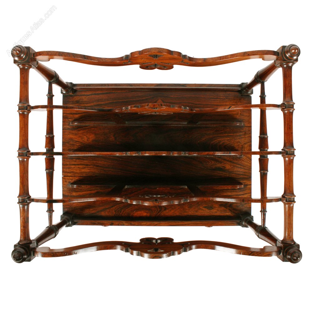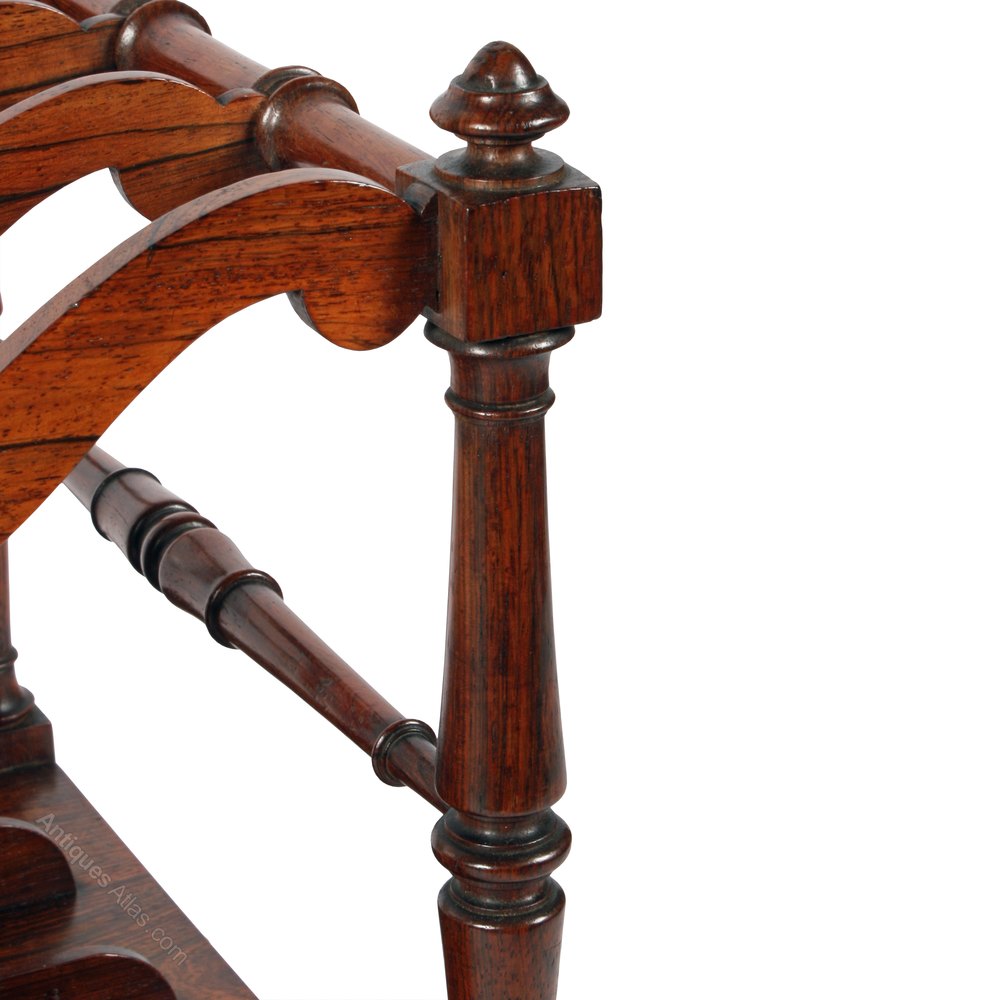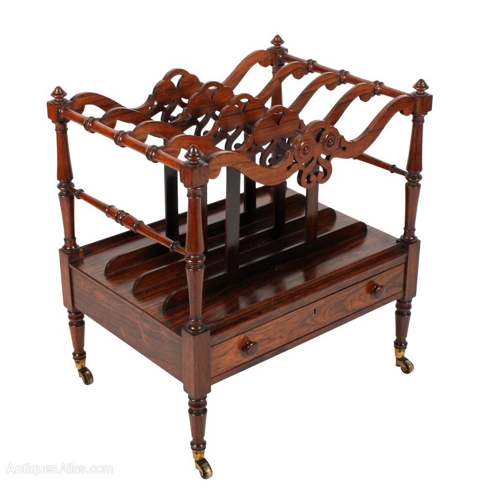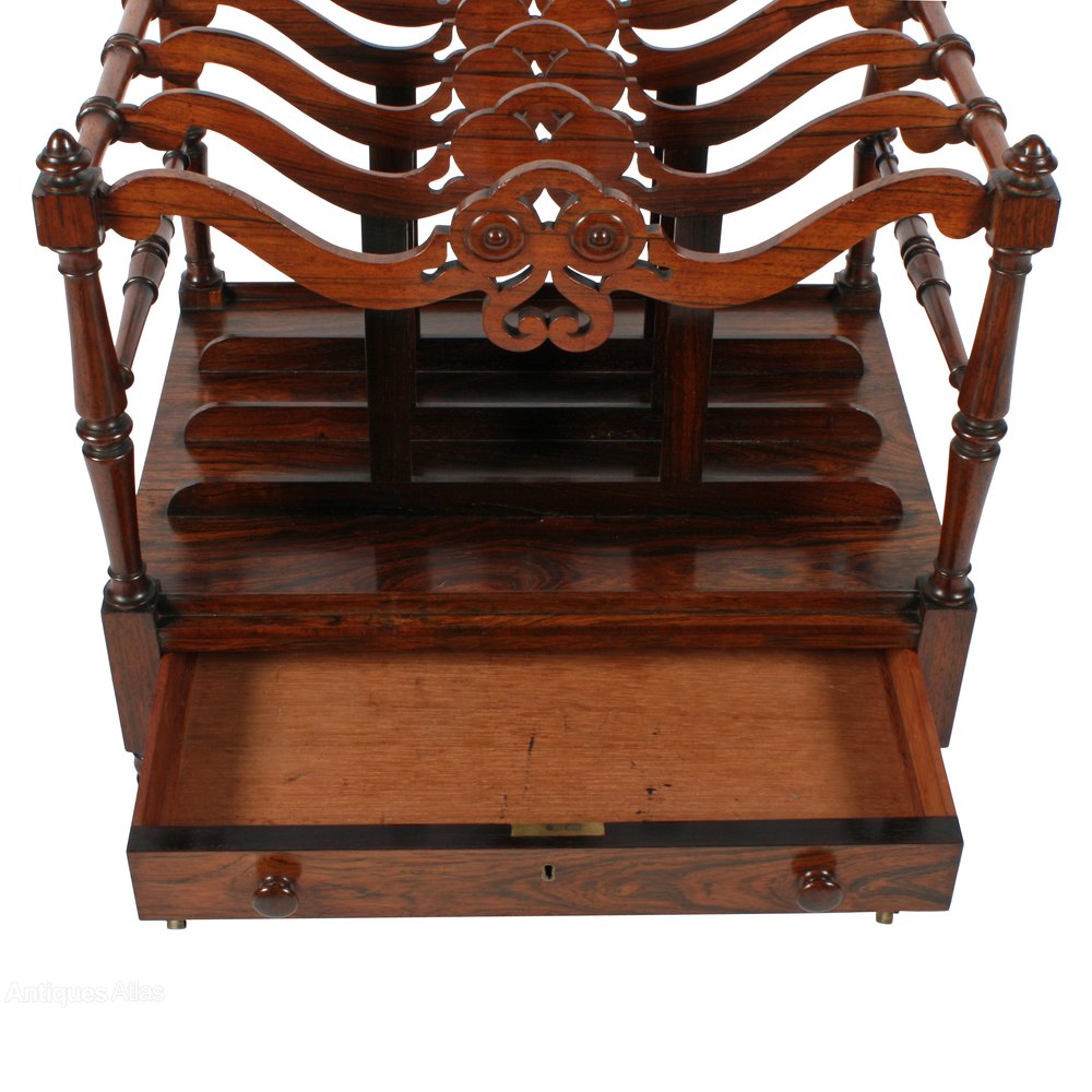The canterbury has a single drawer and a turned rosewood outer frame and legs with five serpentine shaped and fret work division bars.