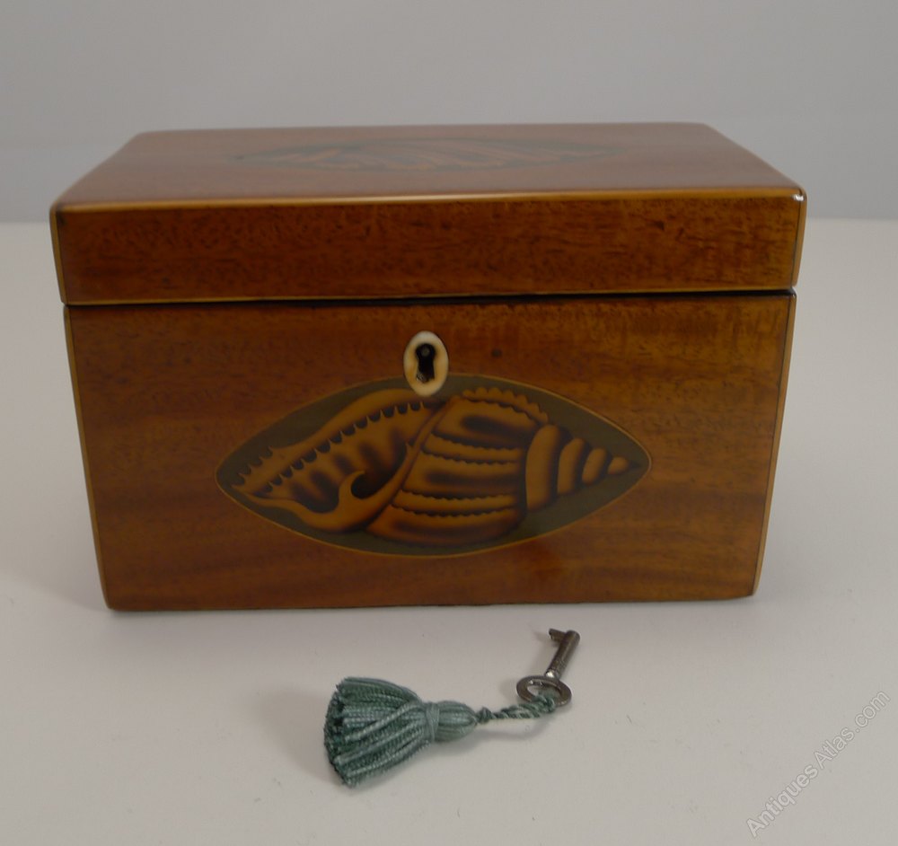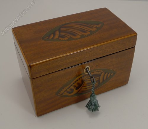 A superb example of a George III tea caddy made from Mahogany trimmmed with boxwood stringing. The front and top are both inlaid with a grand sized shell inlay into a Harewood background.