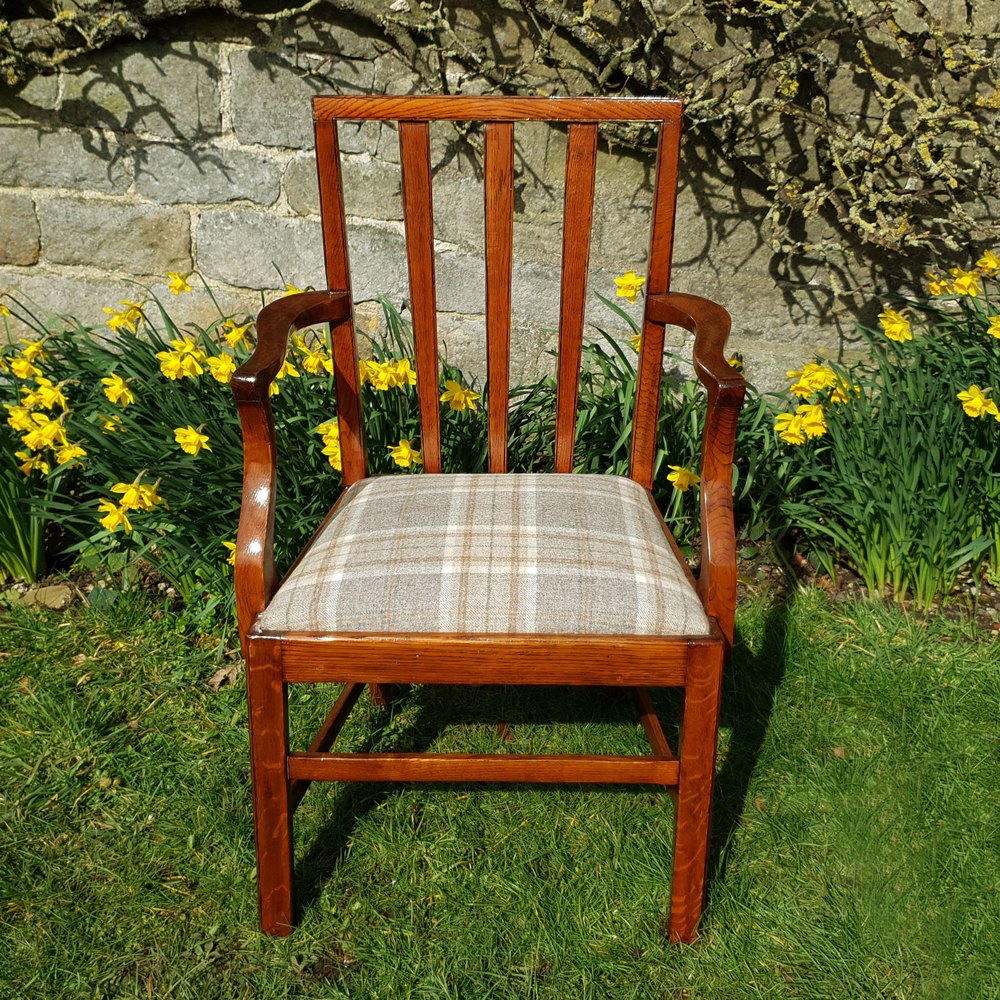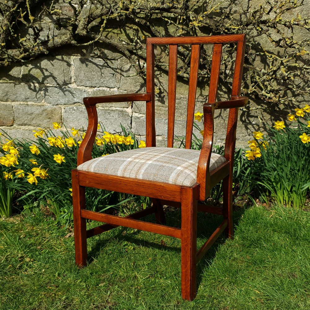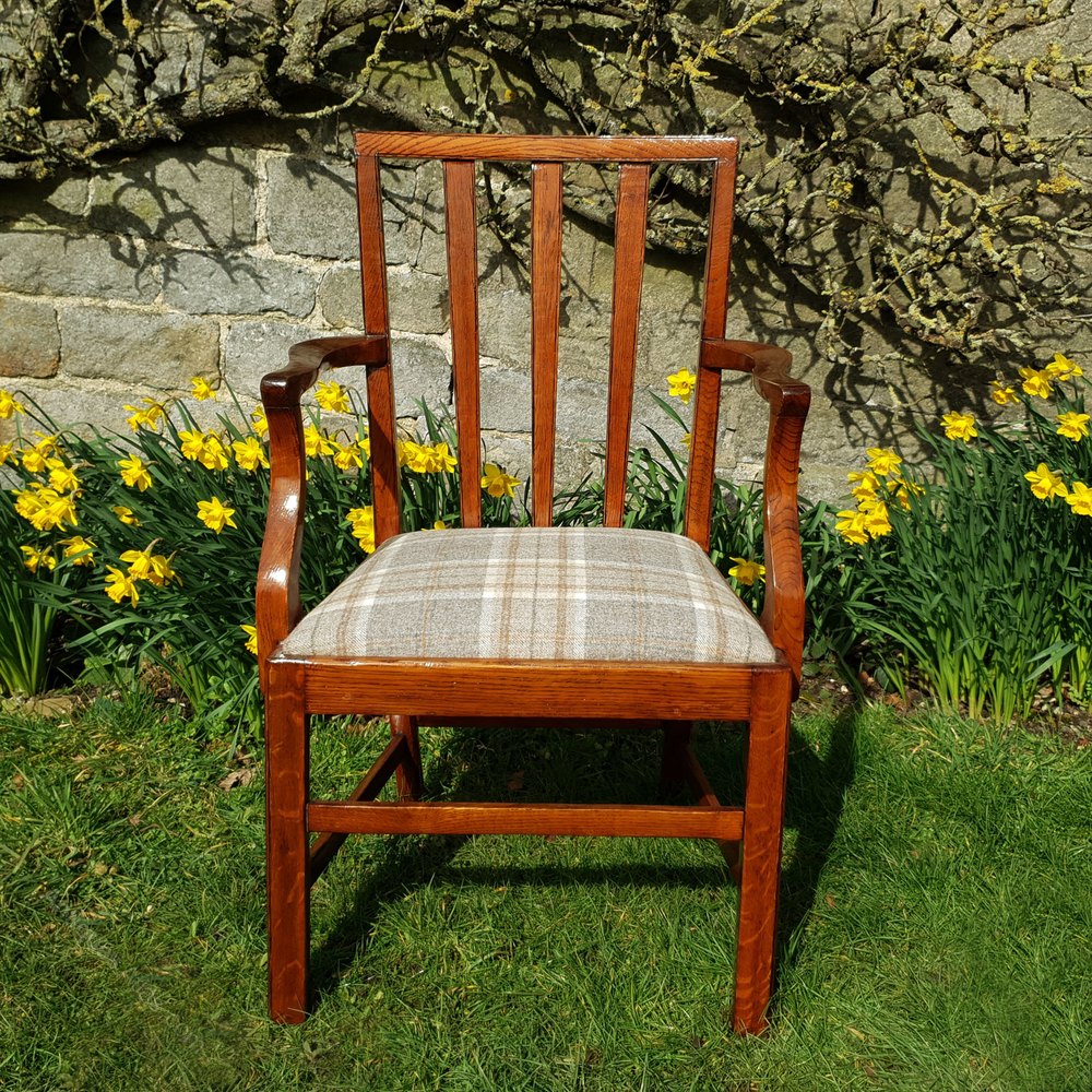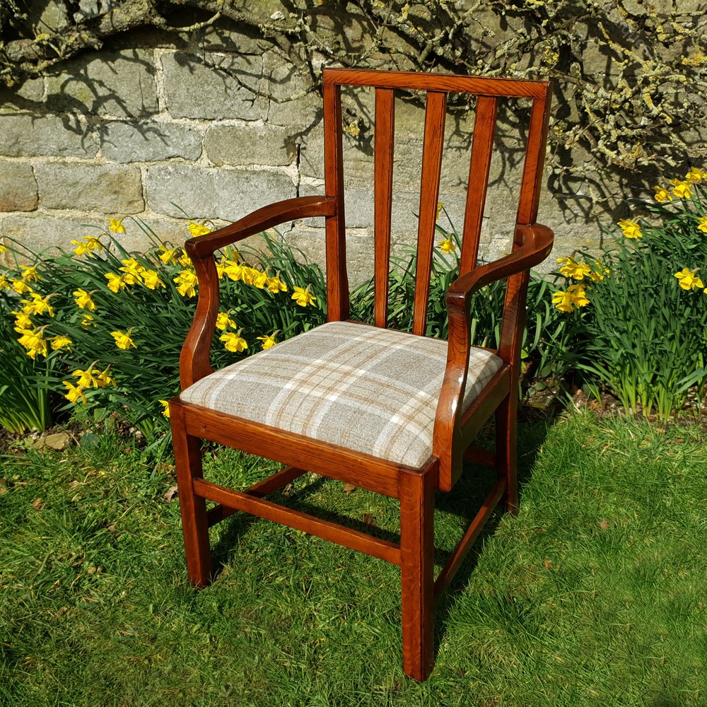 Georgian, Sheraton style, oak carver armchair or desk chair, dating from the C19th. Solid oak framed carver with squared back, with triple fanned splats, curved and shaped open arm rails, over drop-in seat reupholstered in woollen weave checkered fabric by Abraham Moon. Raised on square chamfered front legs, splayed rear legs all supported by stretchers.