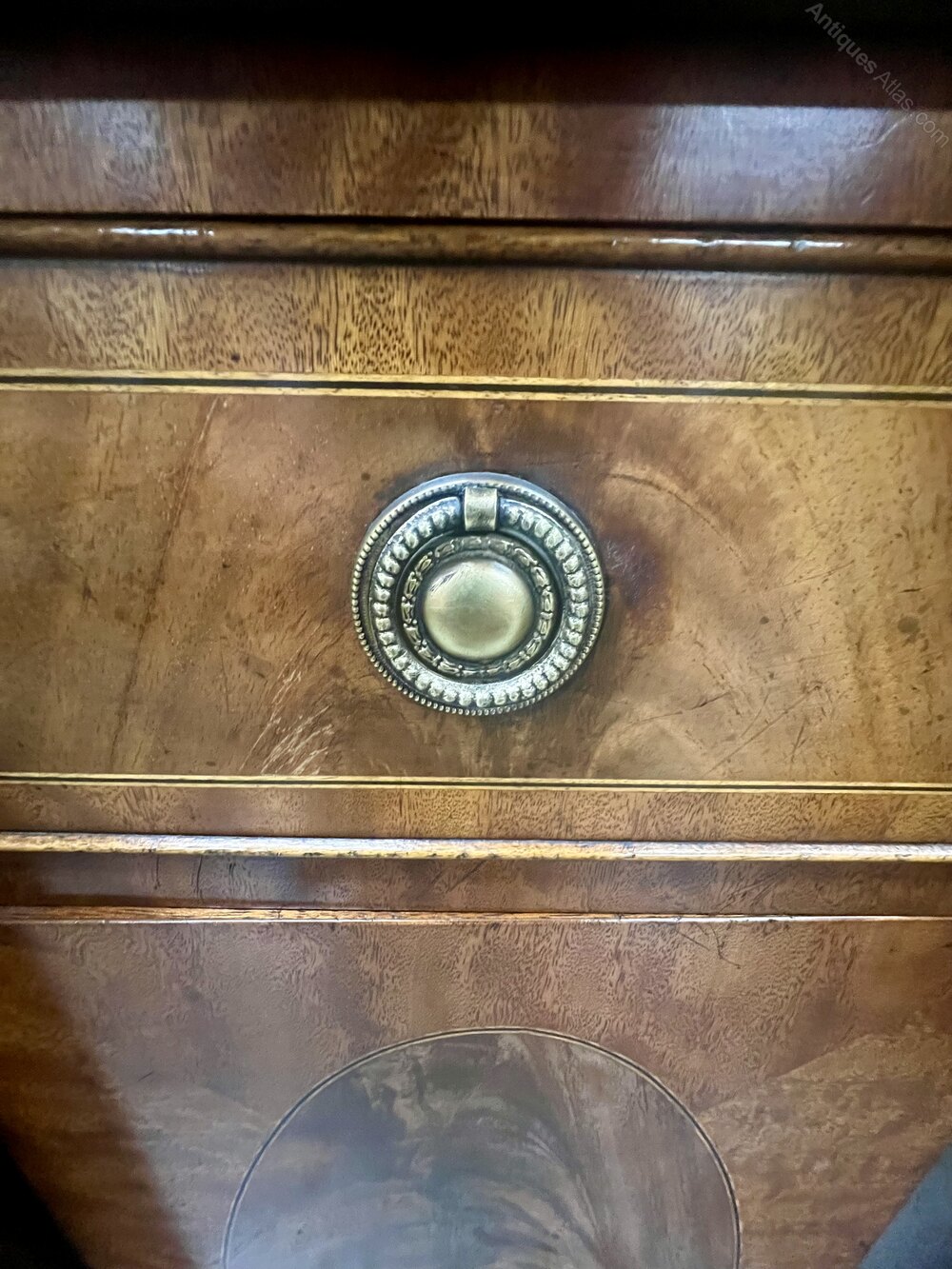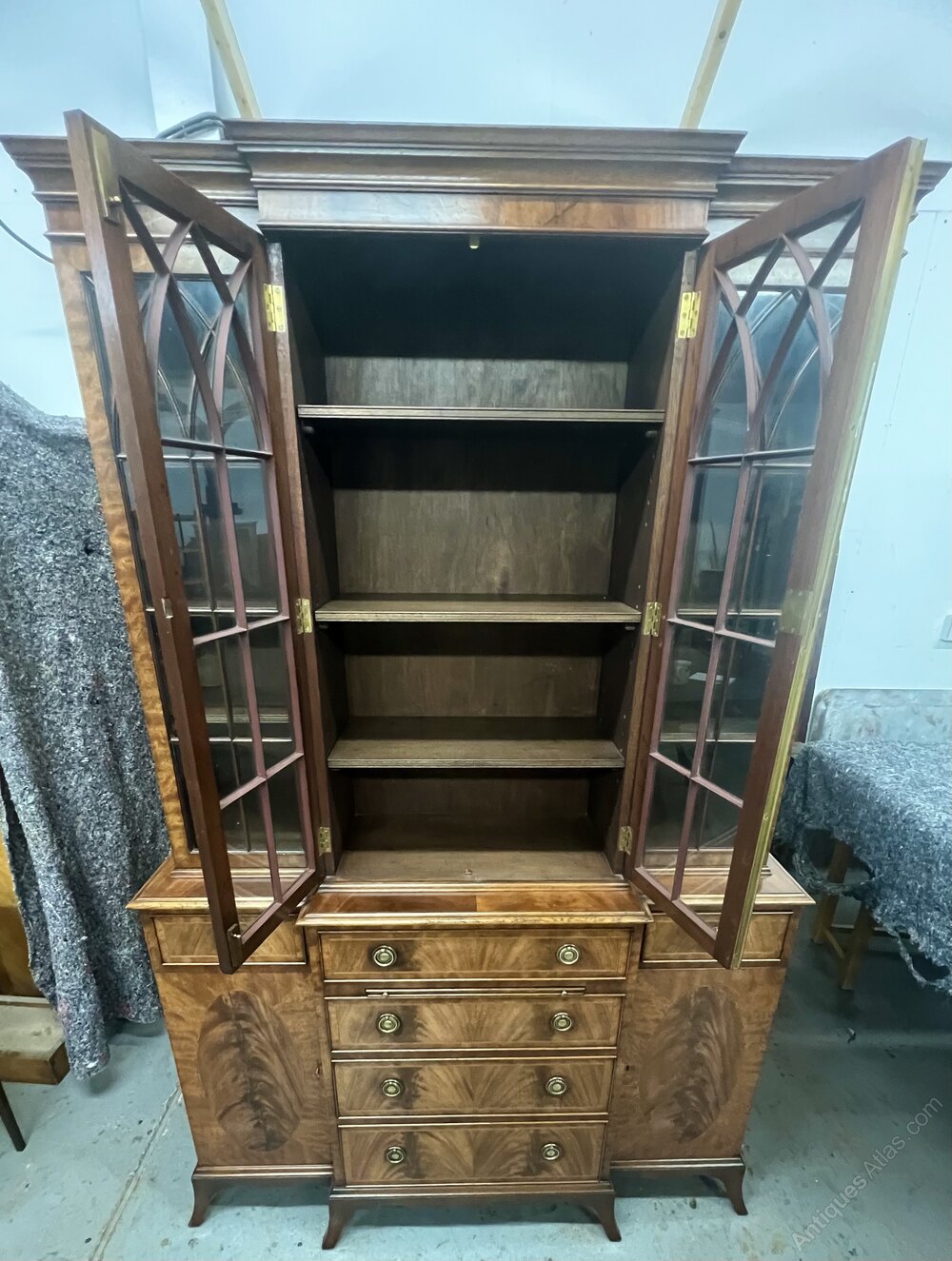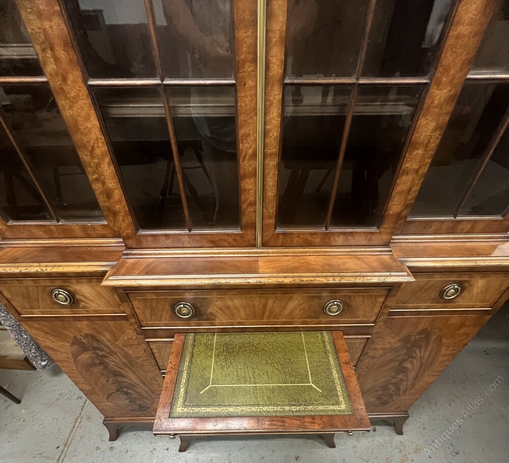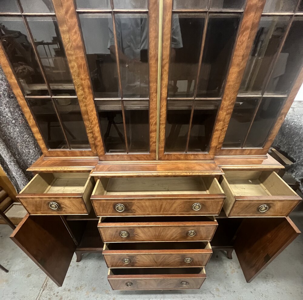 A superb quality 1920’s small Georgian Style figured mahogany and inlaid breakfront bookcase. The stepped and moulded cornice above the 4 cross banded and astragal glazed doors with working locks & keys and open to adjustable shelves. The base section of conforming breakfront form and centred with a bank of 4 cross banded, inlaid and graduated, cock beaded drawers with a pull out writing slide in tooled green leather. The wings having cupboard doors inlaid with large Sheraton style oval panels in flame mahogany and outlined in boxwood and ebony stringing with conforming drawers above.The whole standing on 6 off set elegant splayed feet and complete with brass ring handles and working locks with keys. Transports in 2 pieces. Dimensions:- Height…70.25’’/ 178cm. Width…49.25’’/ 125cm. Depth of Base…15’’/ 38cm. Depth of Top…12’’/ 30.5cm.