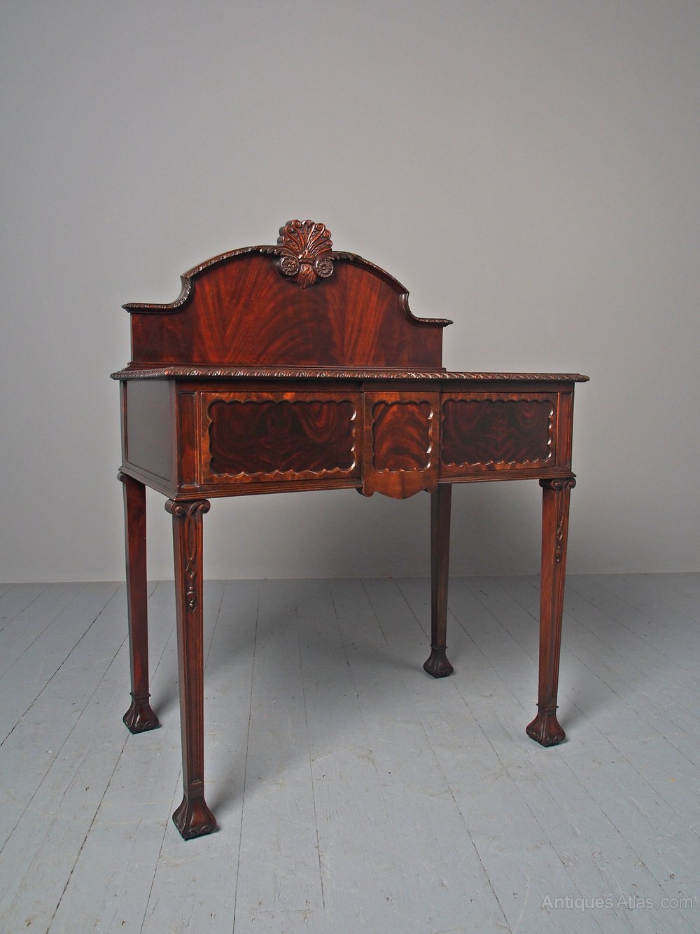 Circa 1890, Georgian-style mahogany hall or serving table. The rectangular top with foliate carved, moulded edges and with an arched back in flame mahogany with foliate carved mouldings, paterae and foliate crest. The long frieze drawer with triple panelled front and mahogany liners. All supported on square tapering legs with moulded fronts and honey suckle flower decoration over short claw feet.