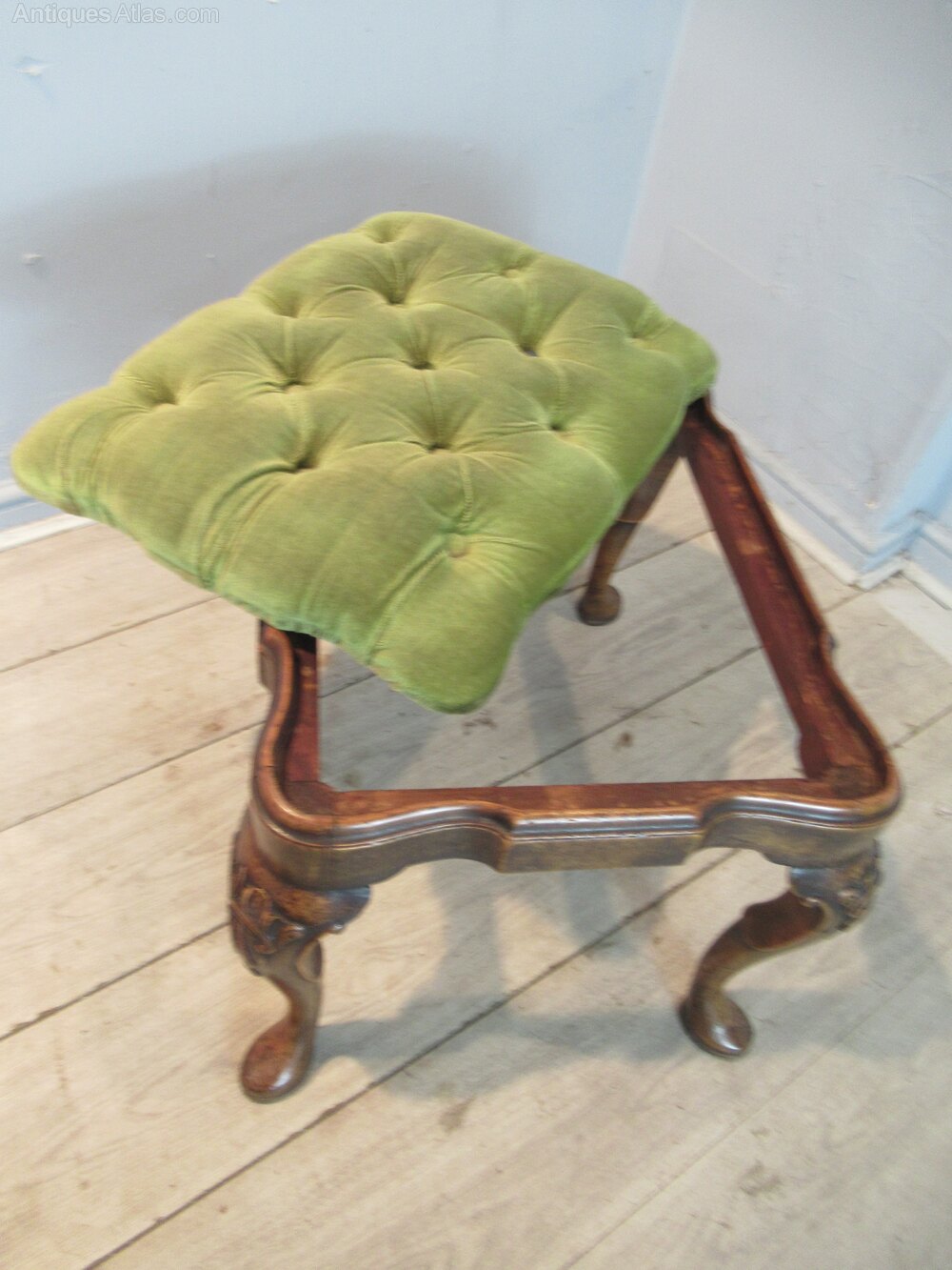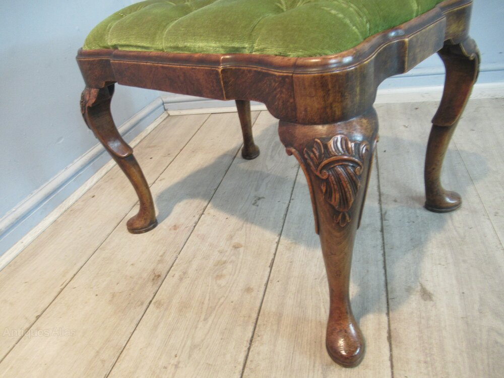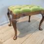 Georgian style walnut stool with a loose drop in seat . The stool has shaped sides and four carved cabriole legs.