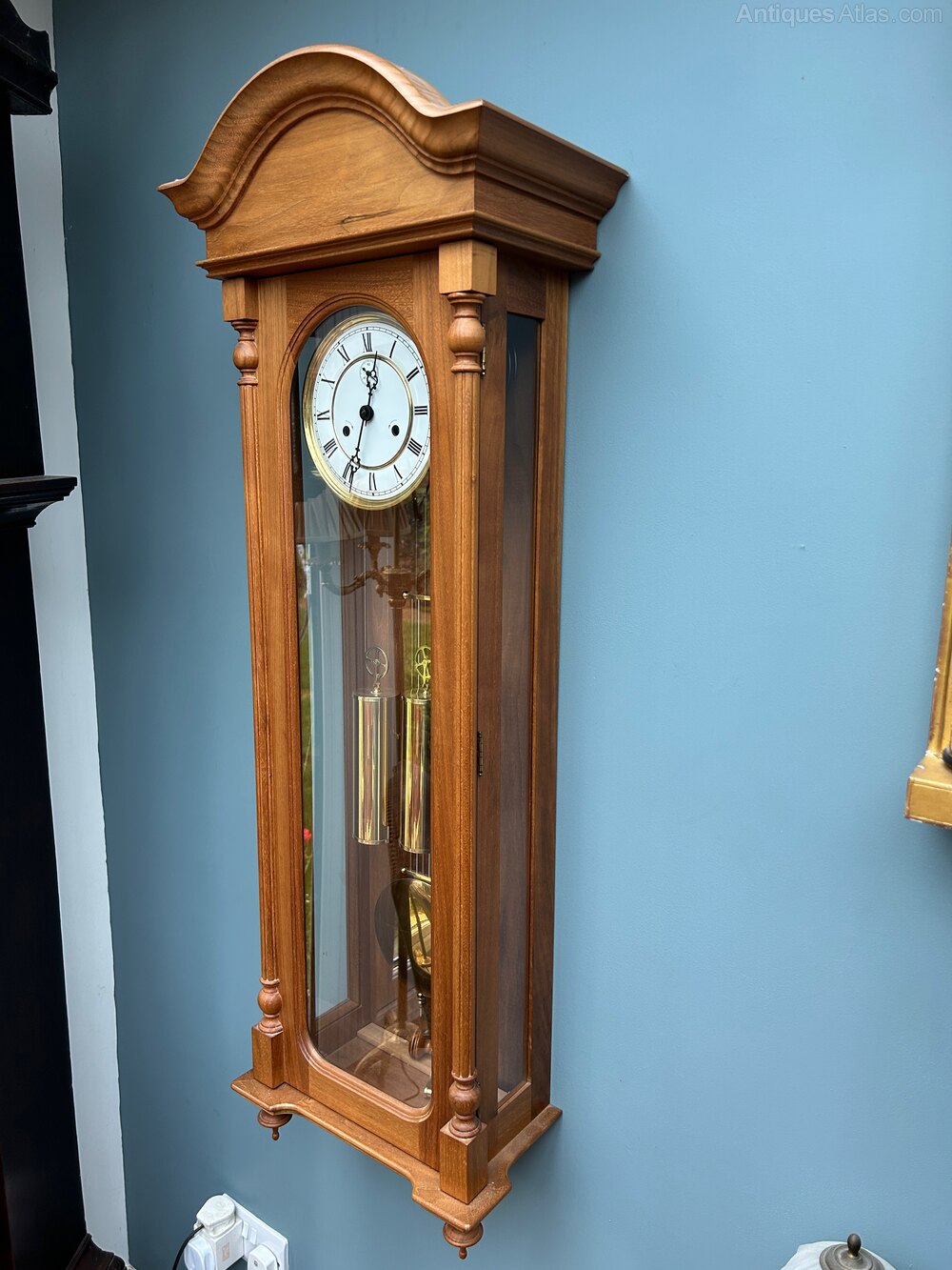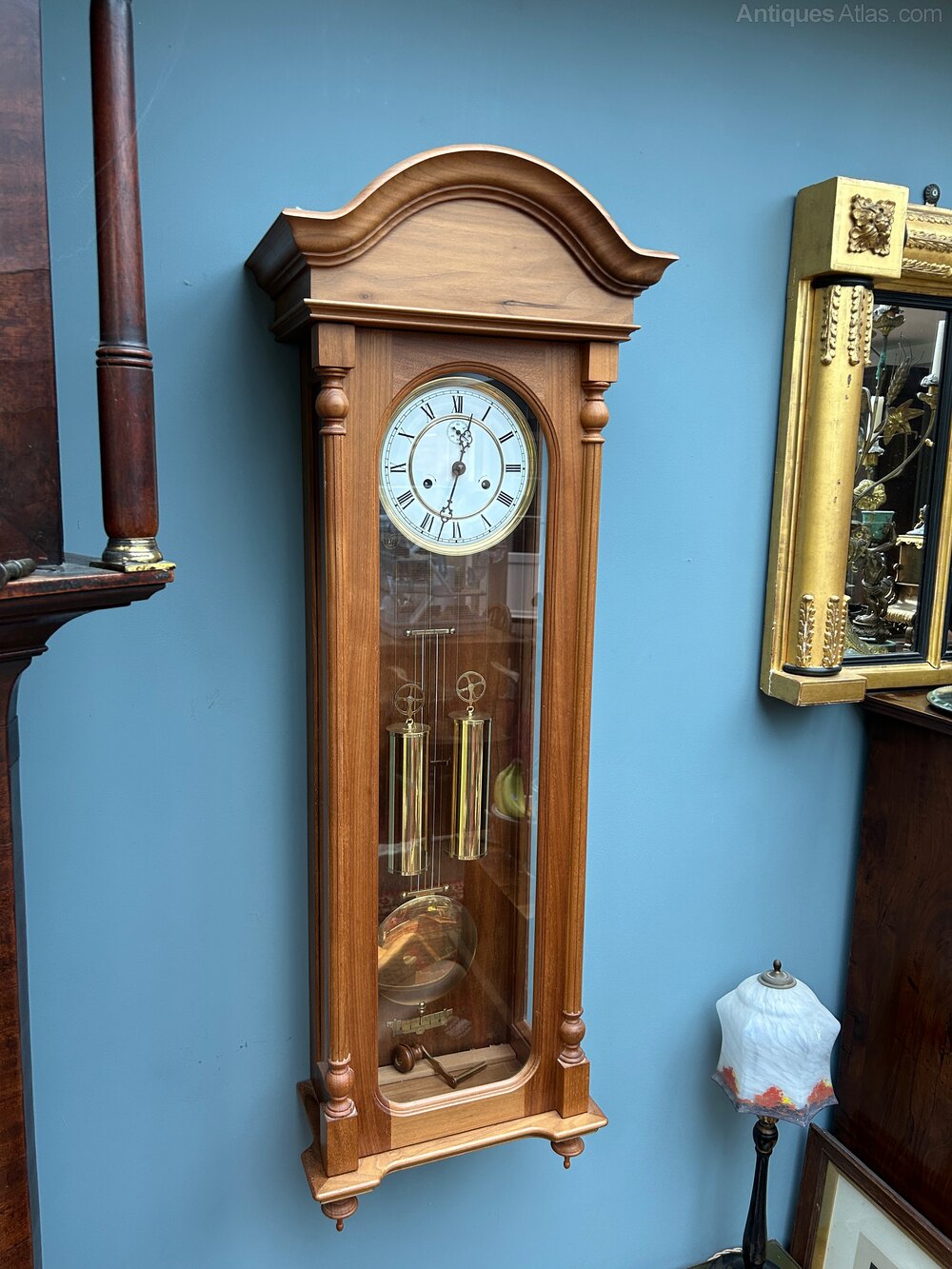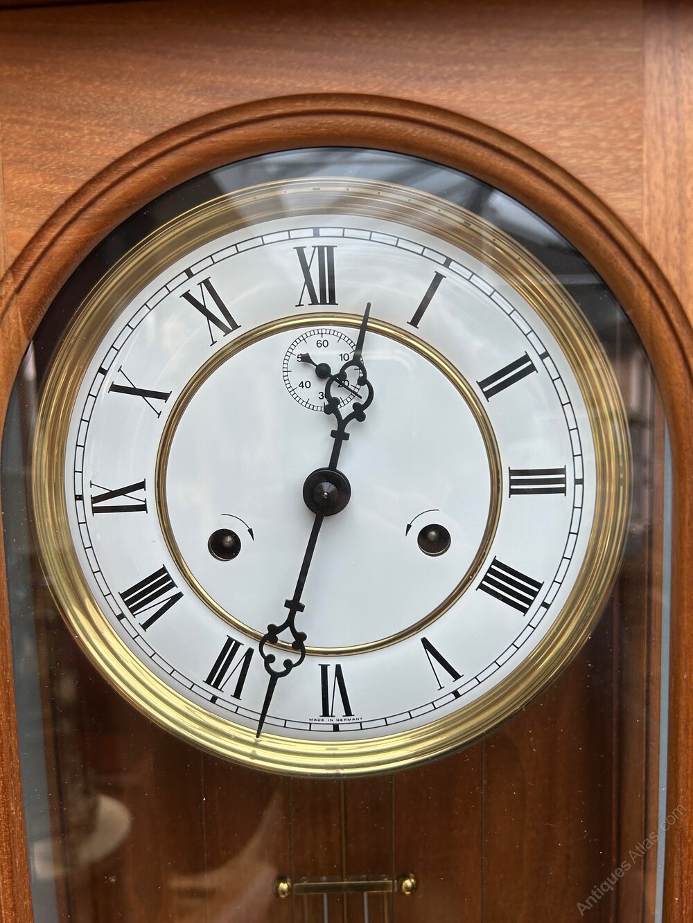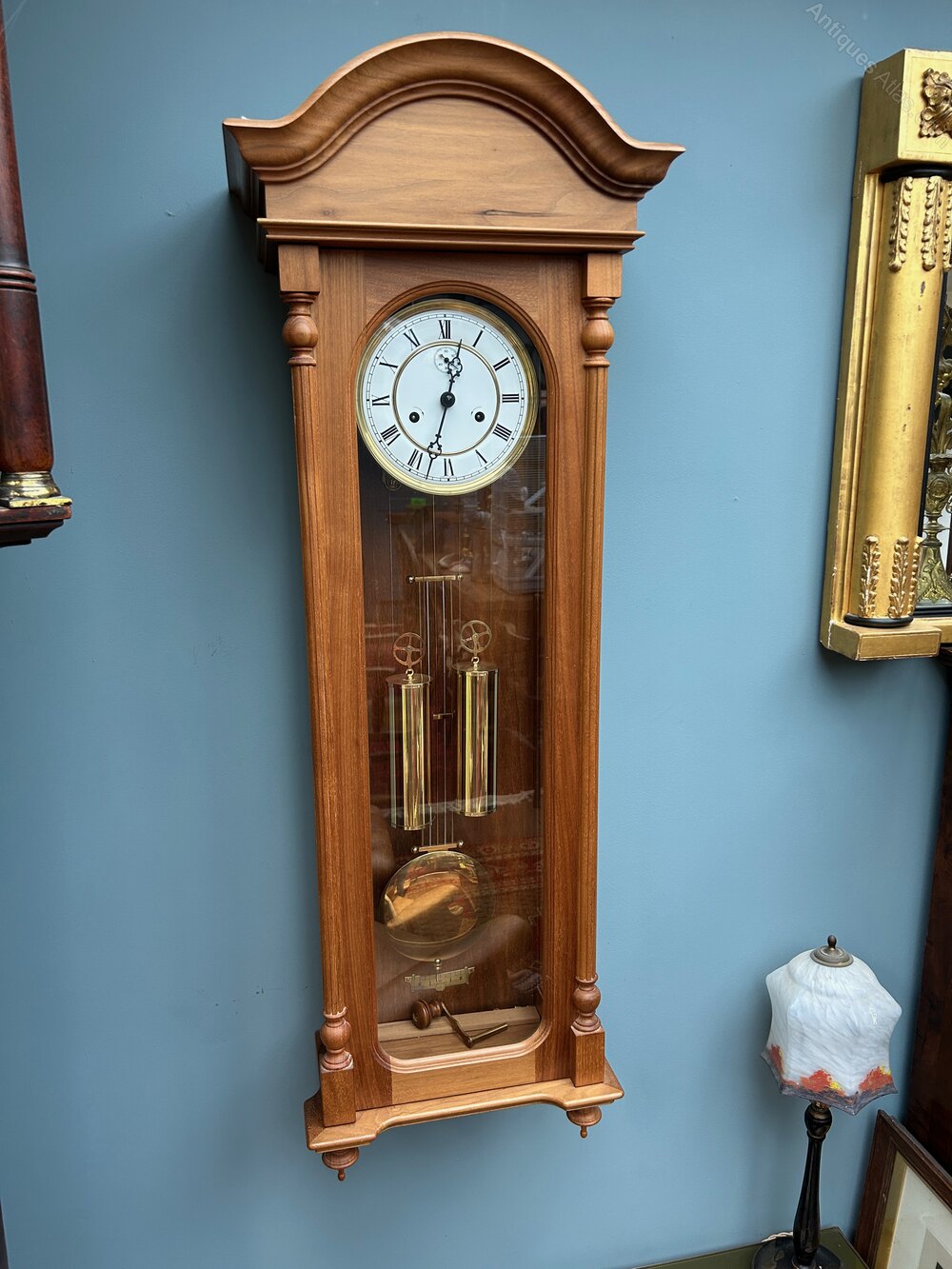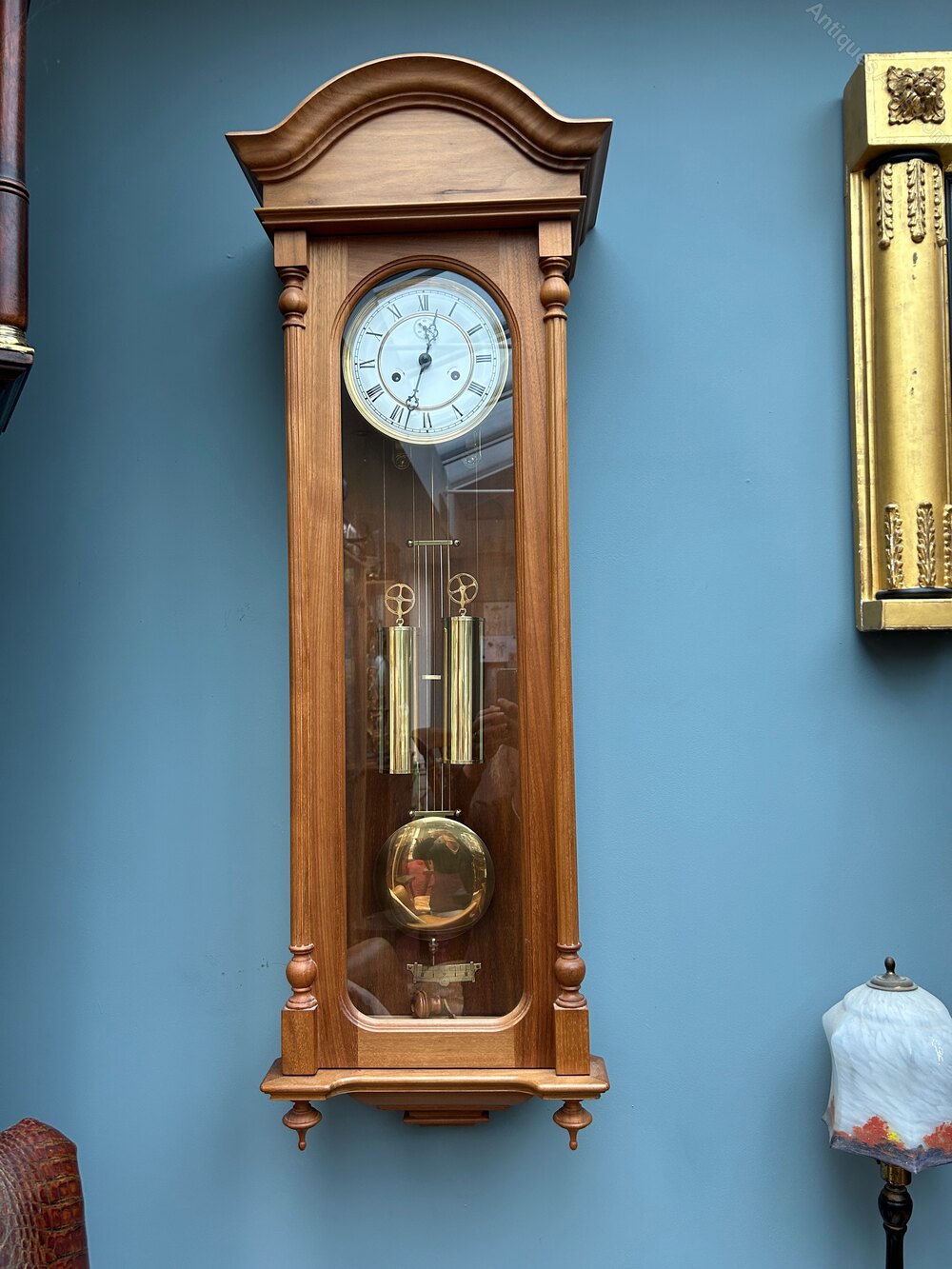 German twin weight Vienna Regulator in full working order. Case in wonderful condition in light mahogany with a white enamel dial. Comes with pendulum and winder. Strikes on the half hour and the hour.