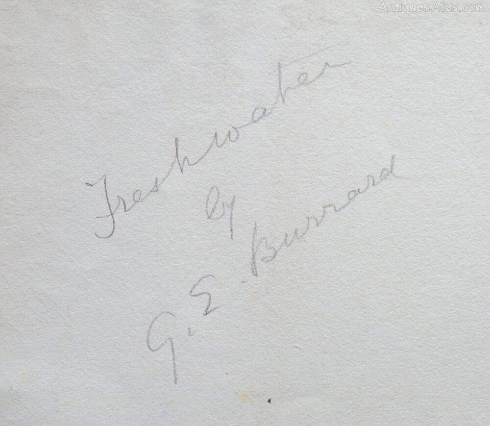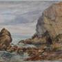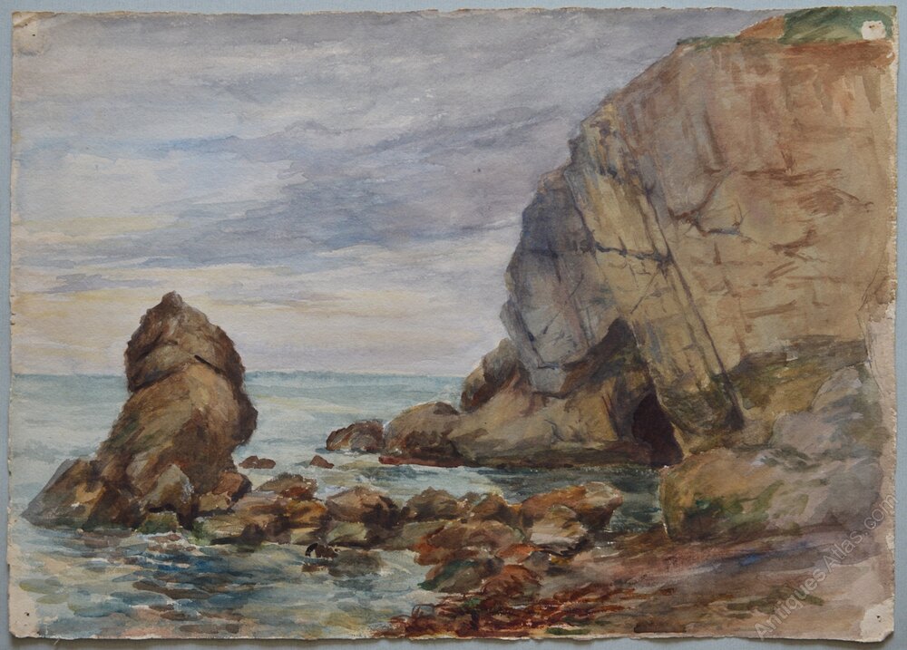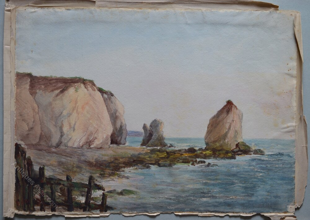 Watercolours x3 of Freshwater, Isle of Wight including, “A Cave”, inscribed Freshwater by G. E. Burrard, in pencil, verso. “A Jetty”, (no inscriptions) and “A Cove with Standing Rock”. Signed G E Burrard (lower left) and inscribed, Freshwater by G. E. Burrard, in pencil, verso.