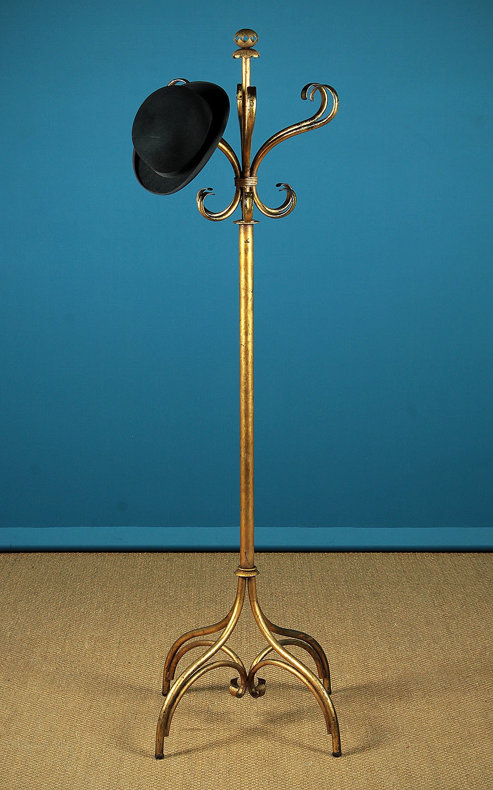 Unusual gilt metal hat and coat stand c.1930. With an 18″ diameter crown of six curving double hooks for hats and coats on a short column topped with a pierced finial and raised on wide set legs for stability. Original gilt finish, attractively worn through in places. Very good condition.