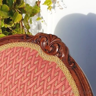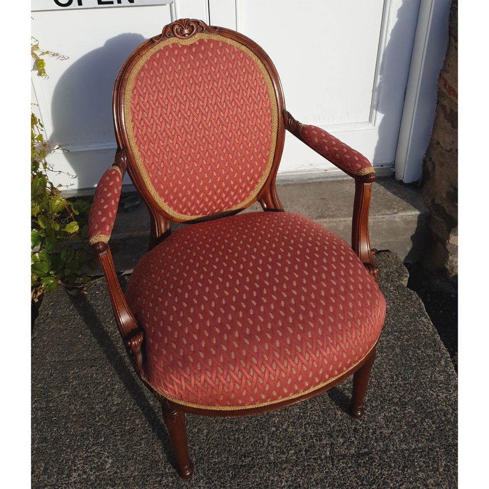 Good 18th century Dutch walnut upholstered salon or drawing room chair. The chair has just come back from being re-upholstered in what I think is a very tasteful material. THe chair has turned legs with carved decoration and there is various carved decoration elsewhere. The chair has nice shape arms also with carved decoration. The chair is in good condition and ready for a new home. There are a couple of minor old repaired cracks to the oval back near the top but these are perfectly solid.