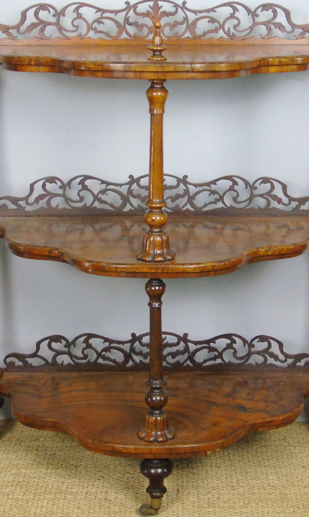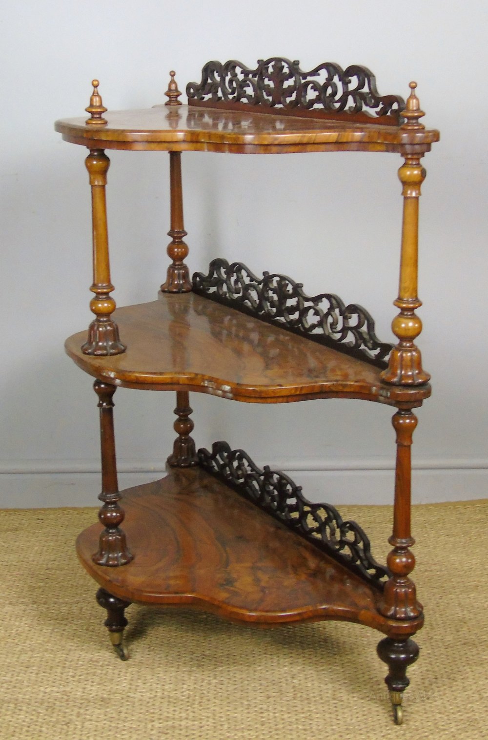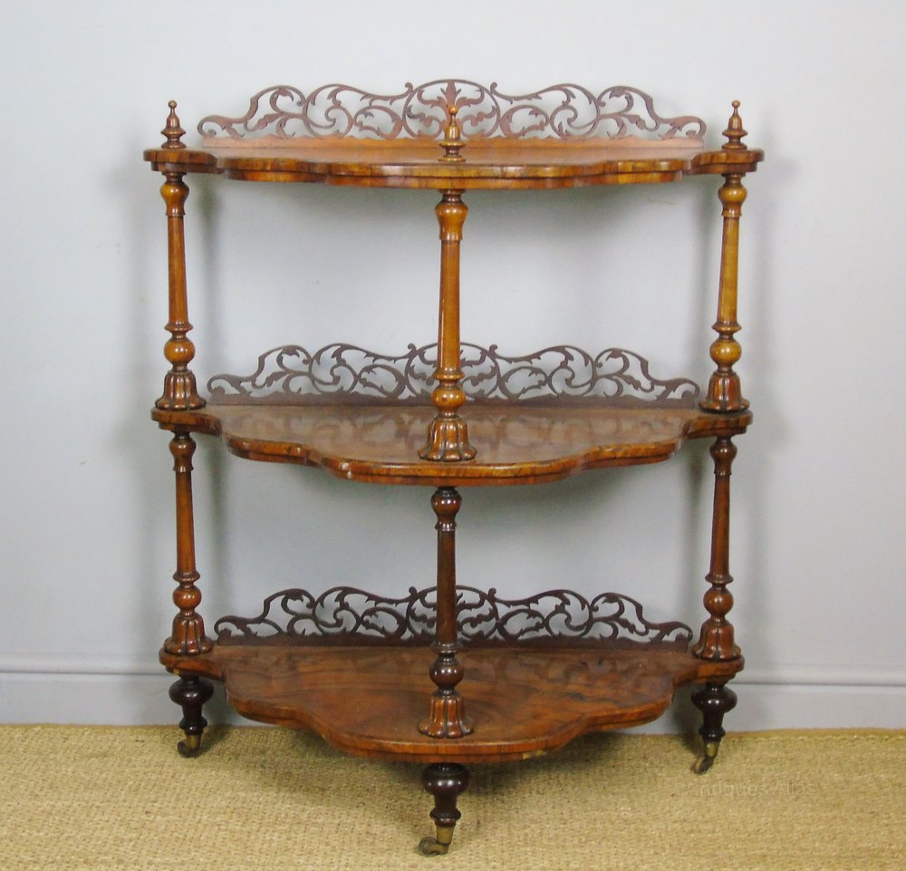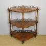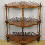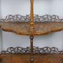 This is a most imposing 19th century whatnot table of good size and with a really decorative appearance. The display stand is in super condition and has a lovely colour and antique patina to the figured mahogany veneers. The back up stands are ornately fret cut in solid mahogany and the whole piece is constructed with solid mahogany turned spindles and attractive large finial surmounts. The stand is raised on its original brass cap castor wheels.