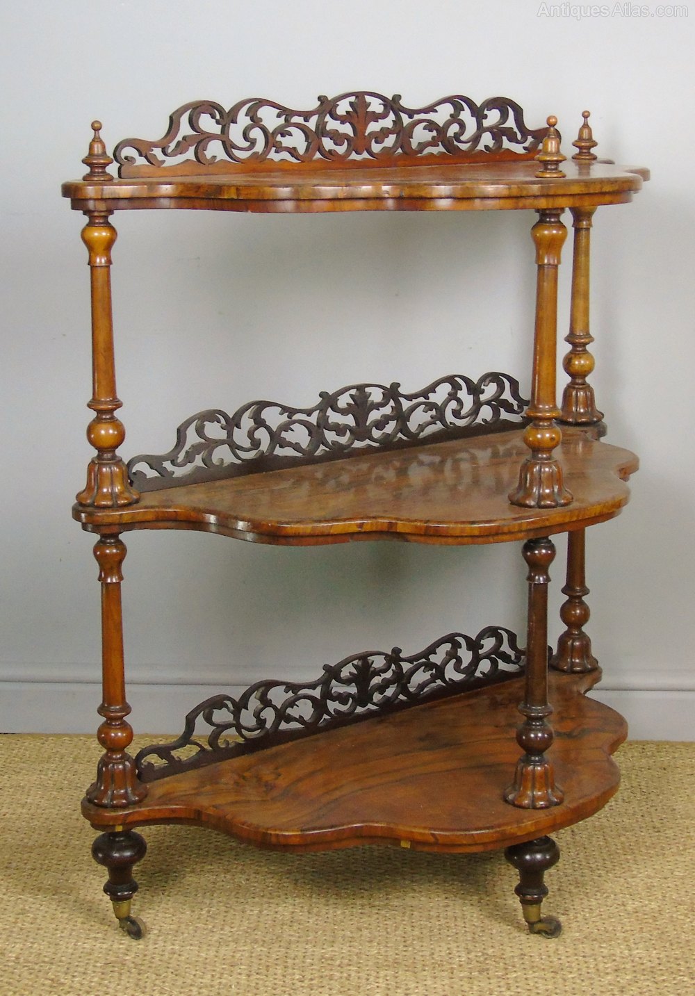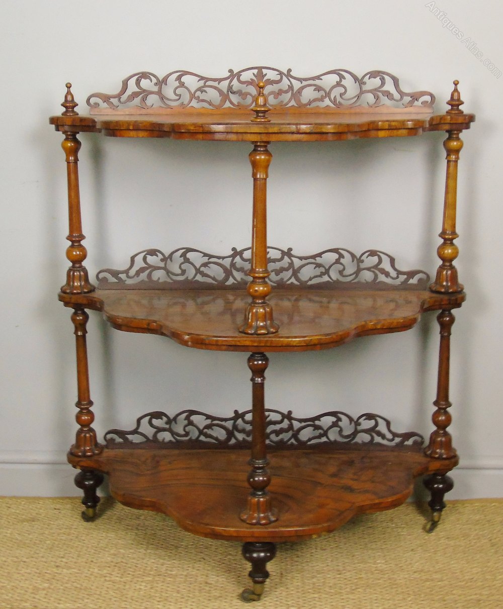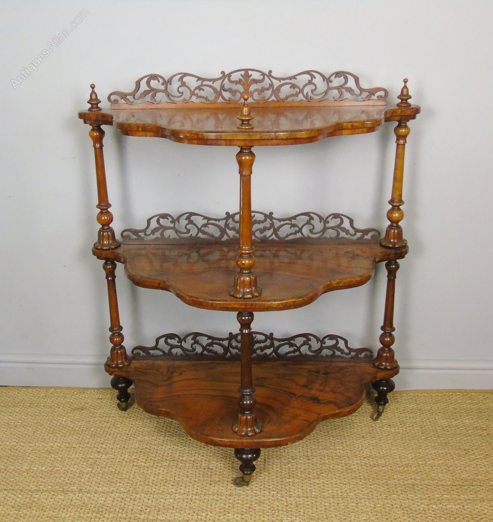 This is a most imposing 19th century whatnot table of good size and with a really decorative appearance. The display stand is in super condition and has a lovely colour and antique patina to the figured mahogany veneers. The back up stands are ornately fret cut in solid mahogany and the whole piece is constructed with solid mahogany turned spindles and attractive large finial surmounts. The stand is raised on its original brass cap castor wheels.