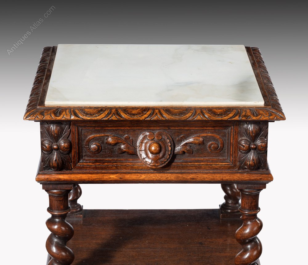Having a square inset marble top with carved moulded edge above a panelled frieze with inset carved oak lined drawer.