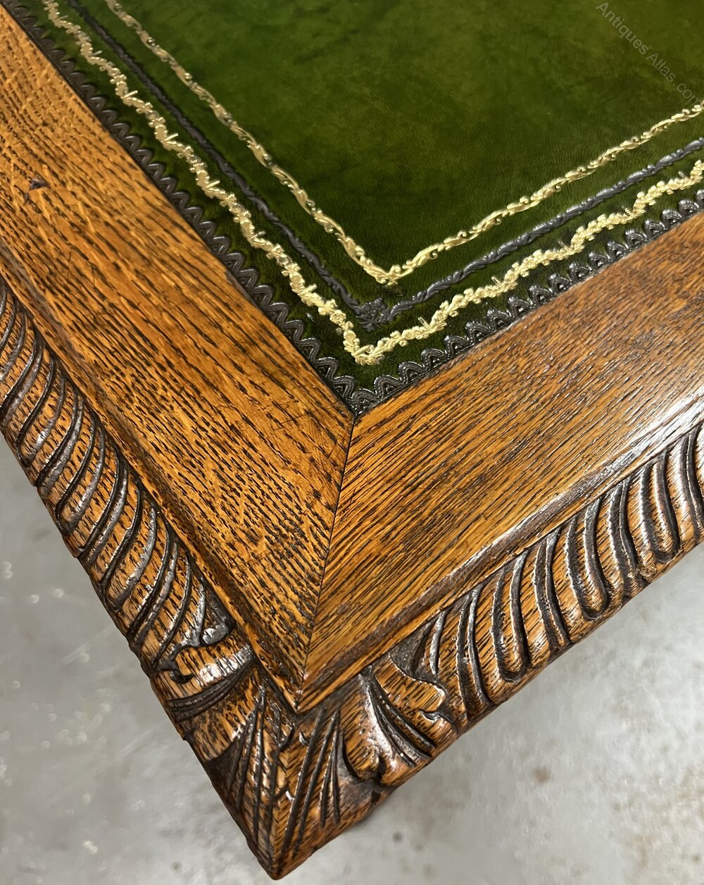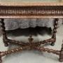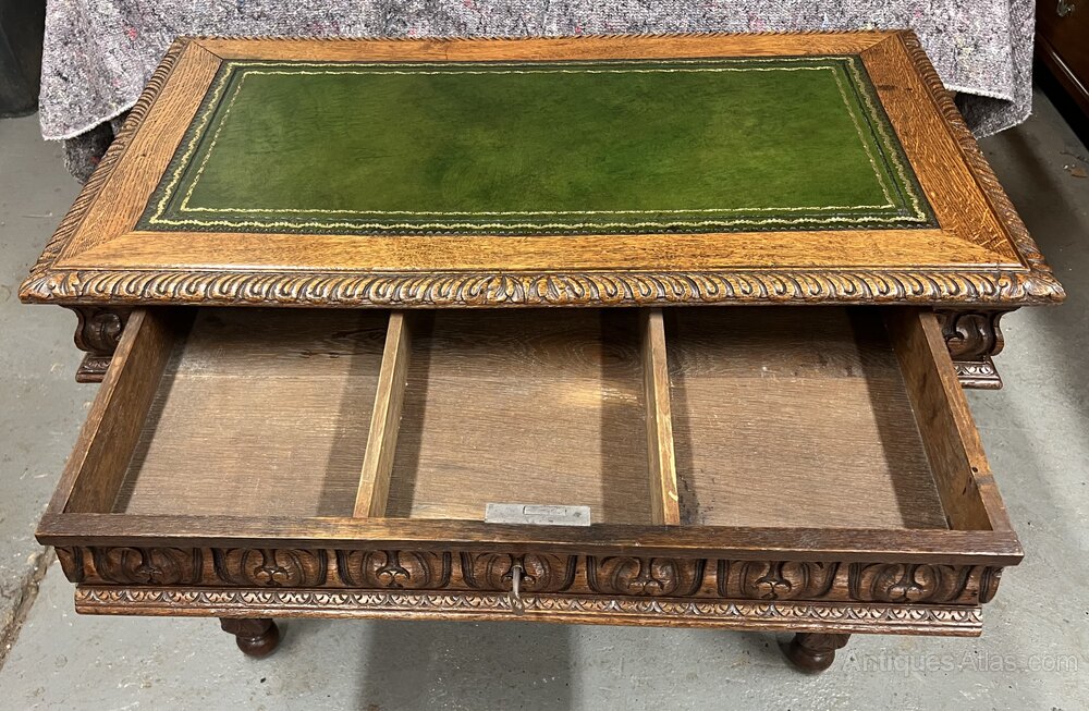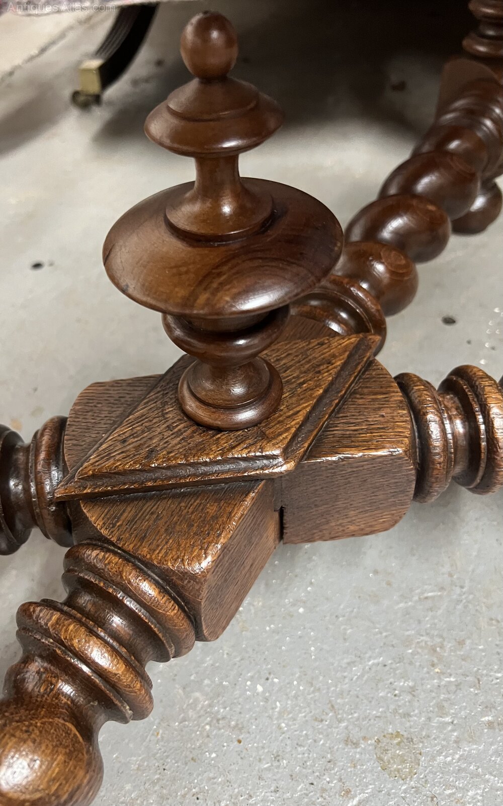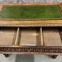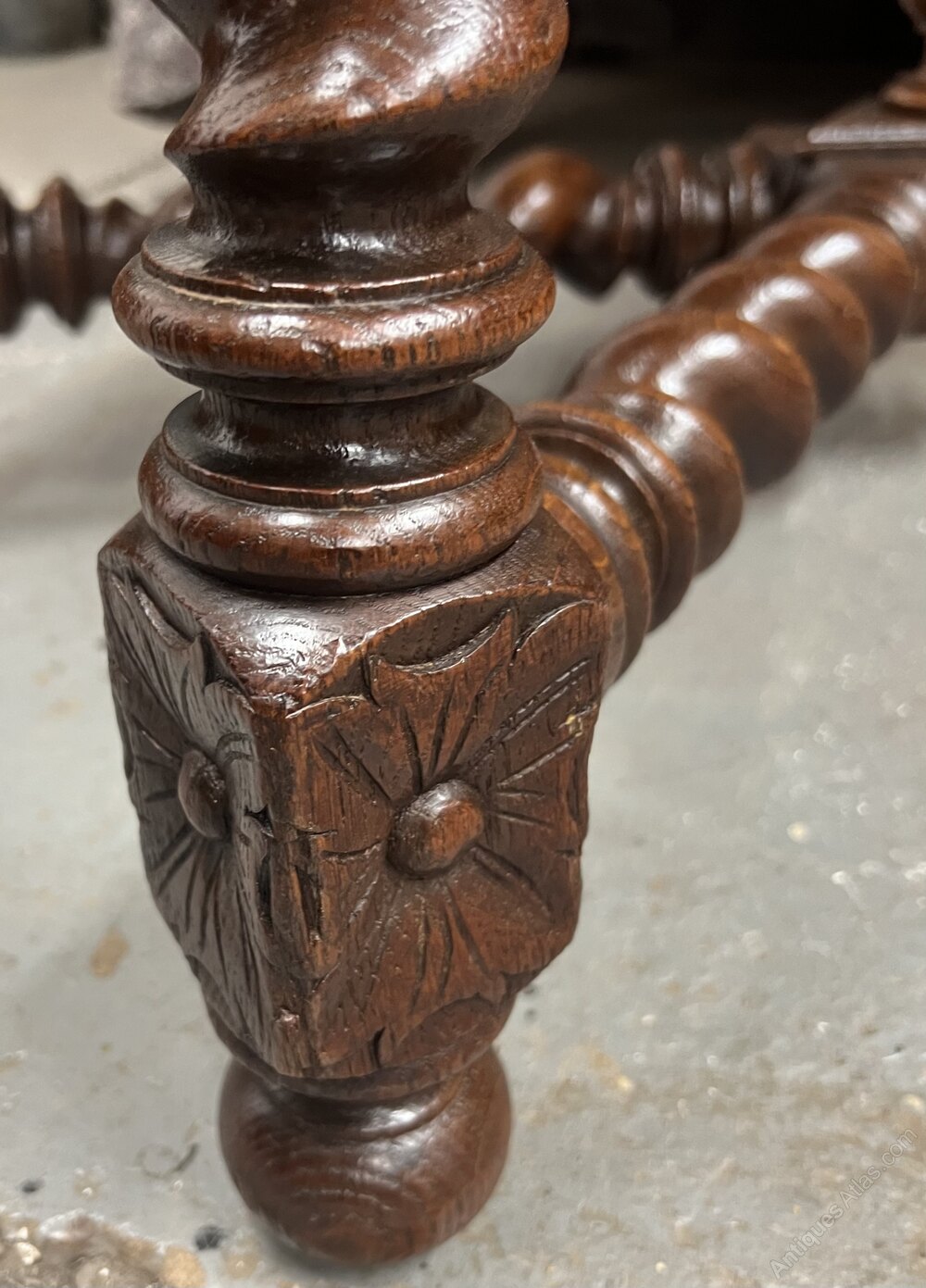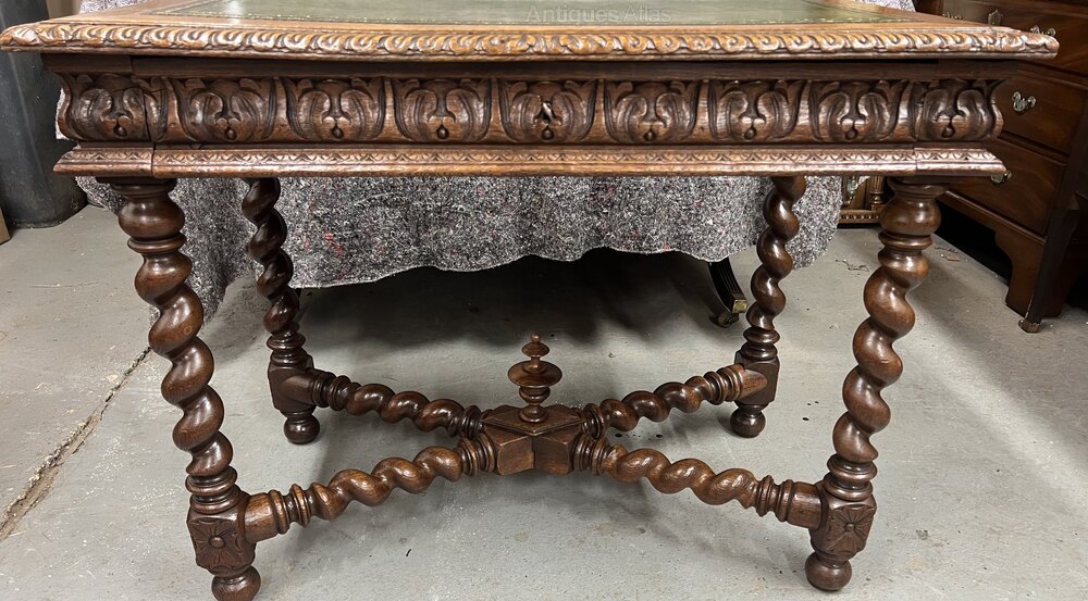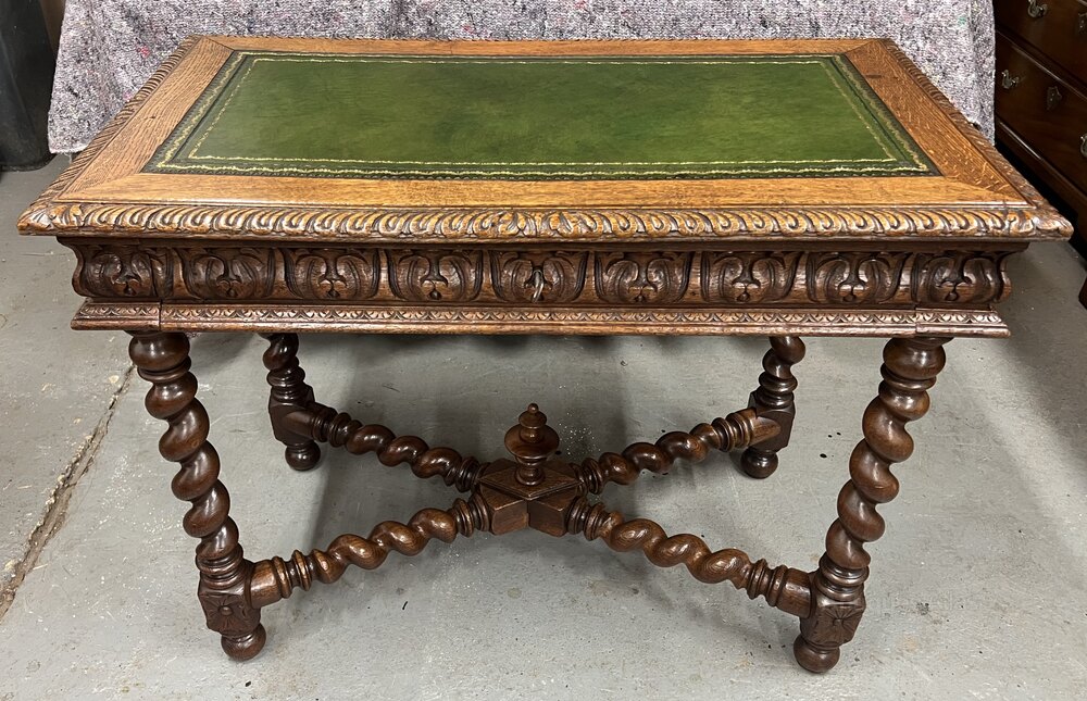 A small & good quality 19th.C. carved oak freestanding writing or hall table. The rectangular shaped top having a replaced in-set hand dyed leather writing surface with blind and gold tooling. The gadrooned edge above the ogee shaped and carved frieze with the useful drawer which has a working lock with key. The whole supported on sugar barley twist legs and cross stretchers with carved patrae and centre turned finial. Condition- Very good. Dimensions:- Height…28.5’’/ 72.5cm. Width…37.25’’/ 94.5cm. Depth…21.75’’/ 55cm. Delivery to most of U.K. mainland £50.