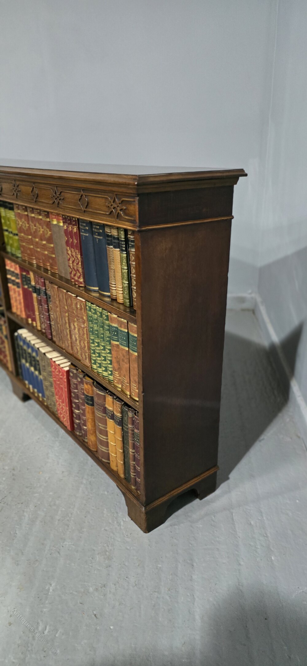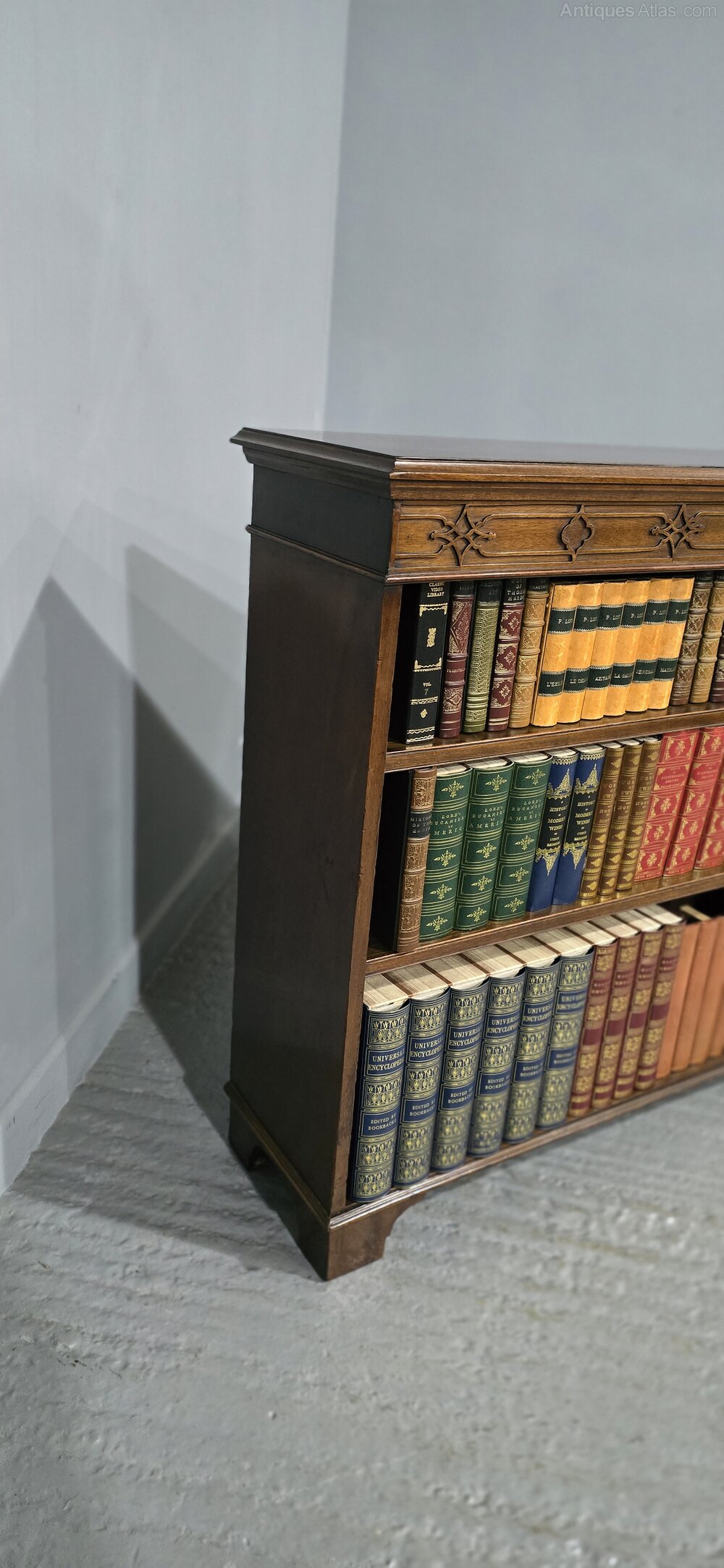 A very good mahogany open adjustable library bookcase, split into four shelves, blind fretwork detailing, standing on bracket feet and in overall very good condition.