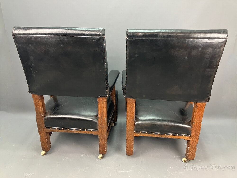 A wonderful pair of Victorian Reformed Gothic library or easy chairs, dating to circa 1870-80, the oak frames upholstered in black leather. The frames have chamfered supports and ceramic castors, the upholstery is probably a late 20th Century replacement but very well done. They are very comfortable to sit in! Offered in good condition, commensurate with age, they have some markings but overall look good. Each measures 95cm tall, 58cm wide and 69cm deep, with the seat 46.5cm wide at the front and 41cm at the rear and 37.5cm tall. The price includes delivery within 30 miles of Taunton, please contact me for a delivery price if further afield.