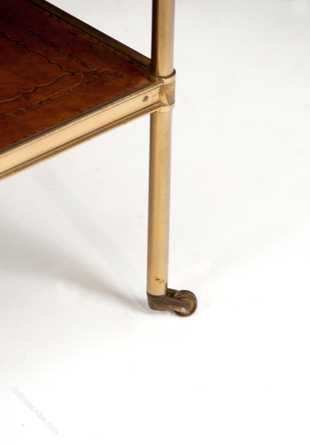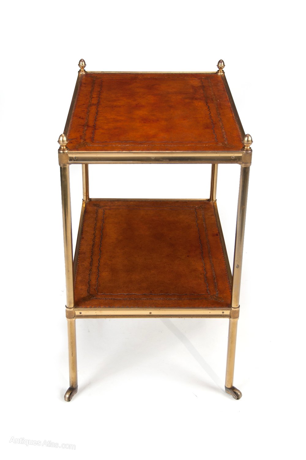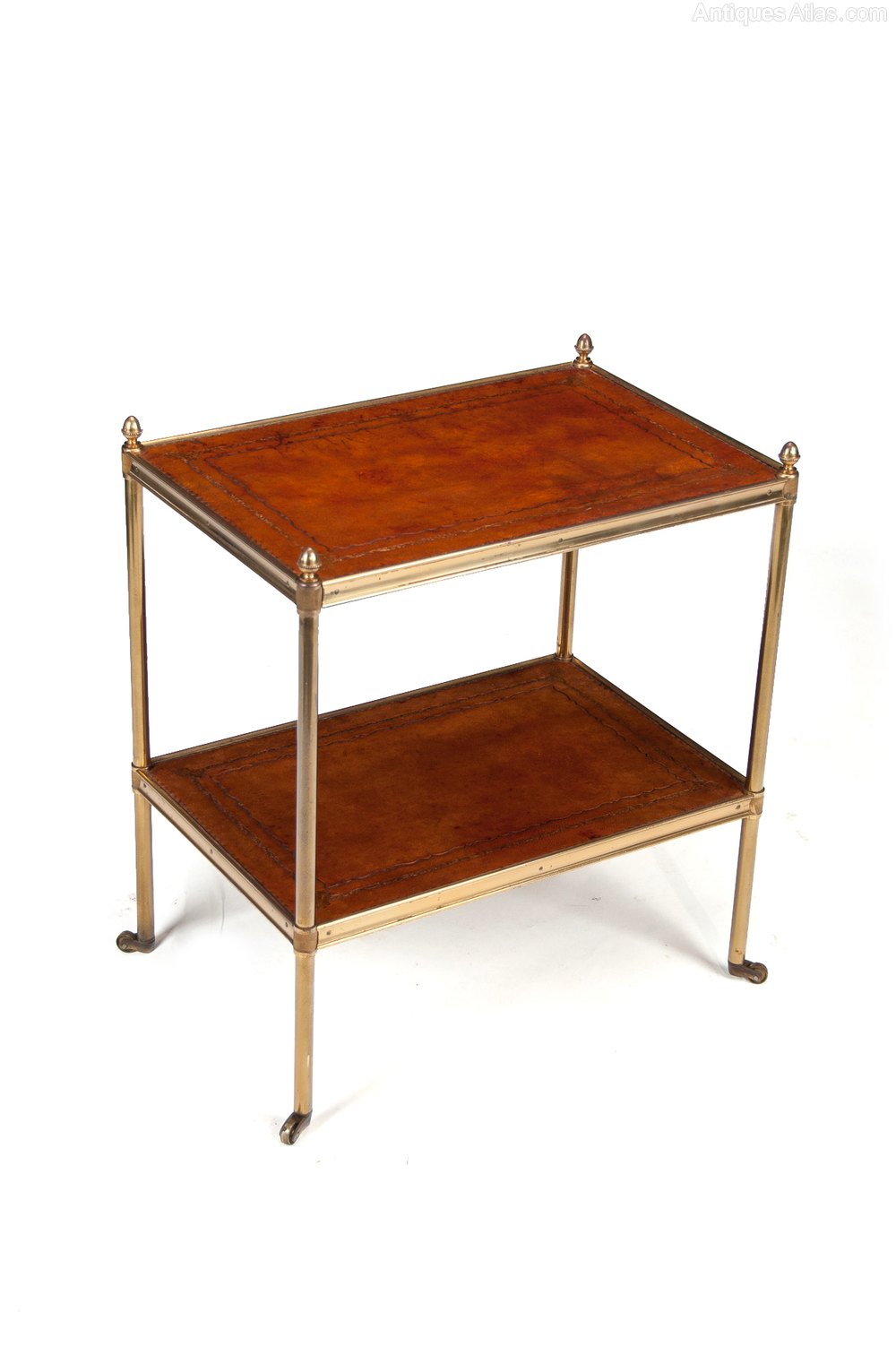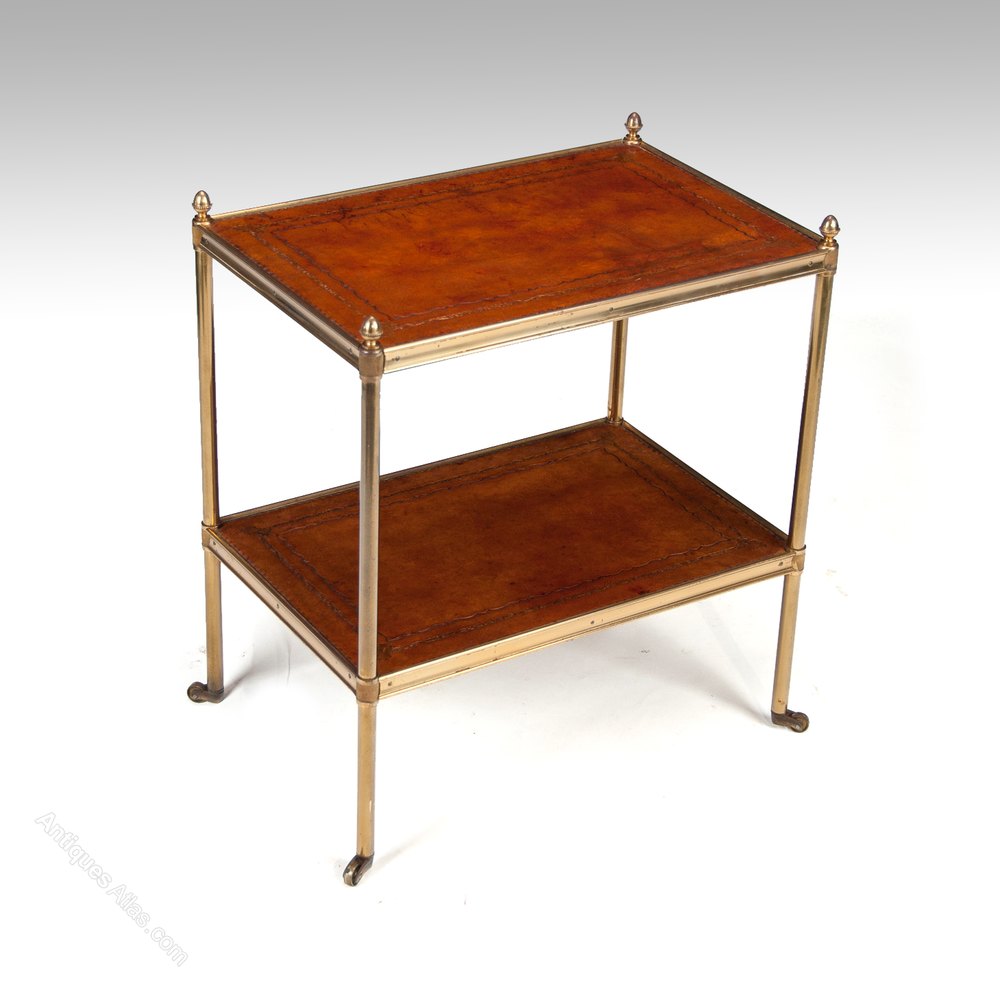 A good quality brass and leather two-tier etagere on squat castors circa 1920