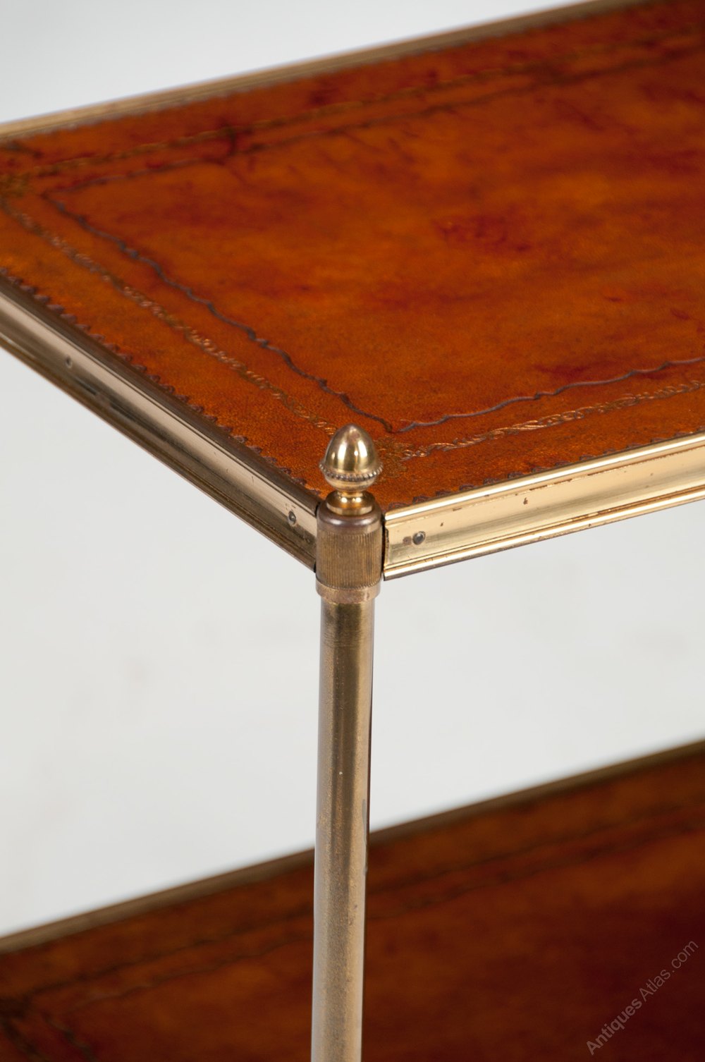 In excellent condition this good quality etagere has a lovely faded tan colour to the leathers and original finish to the brasswork.