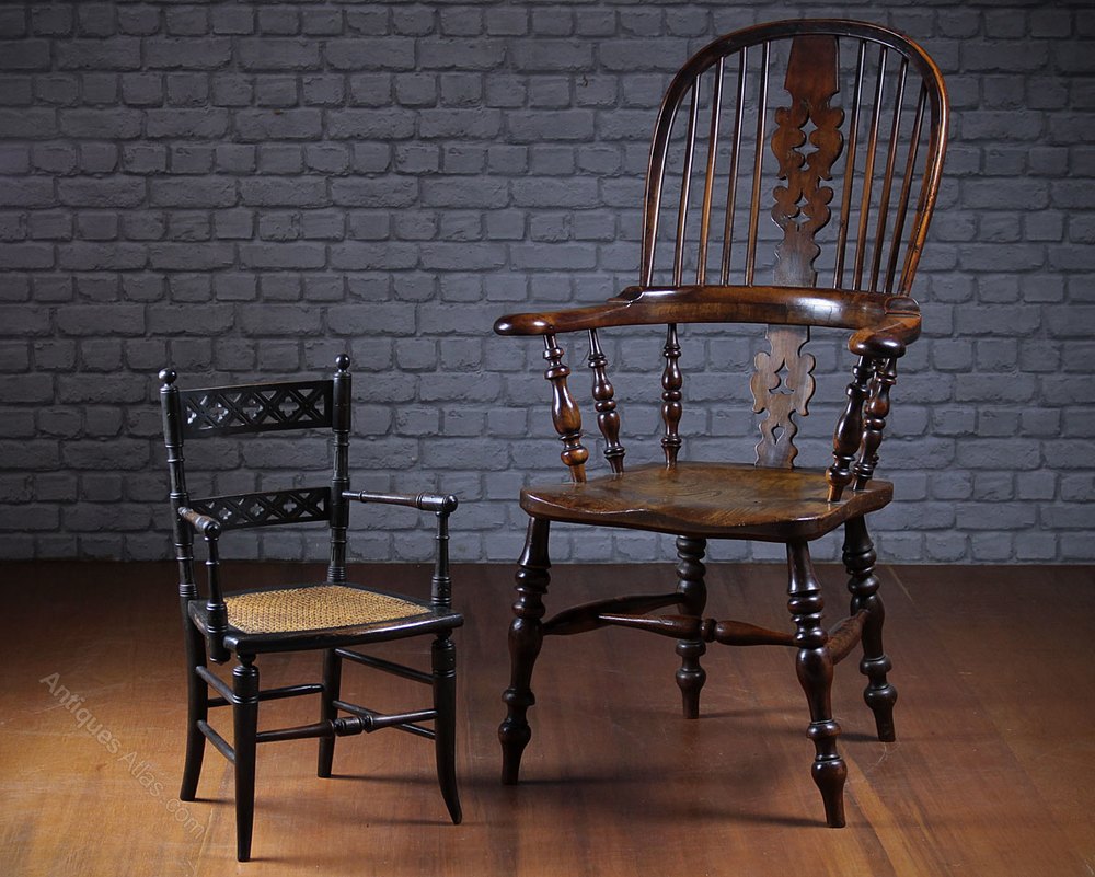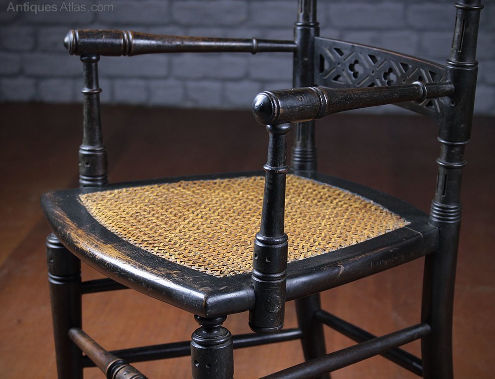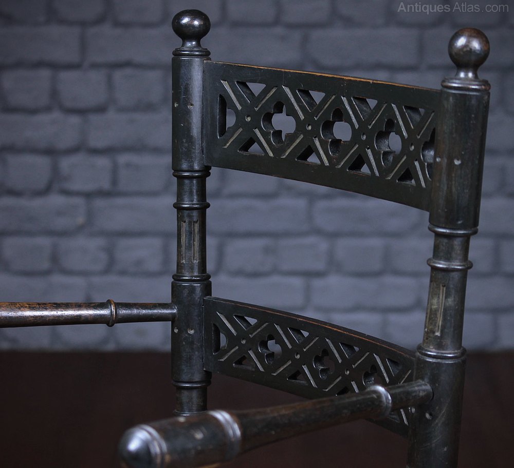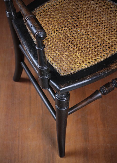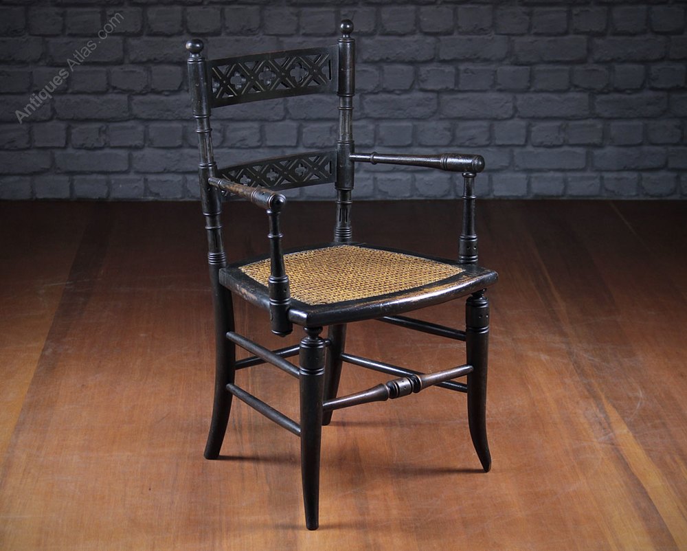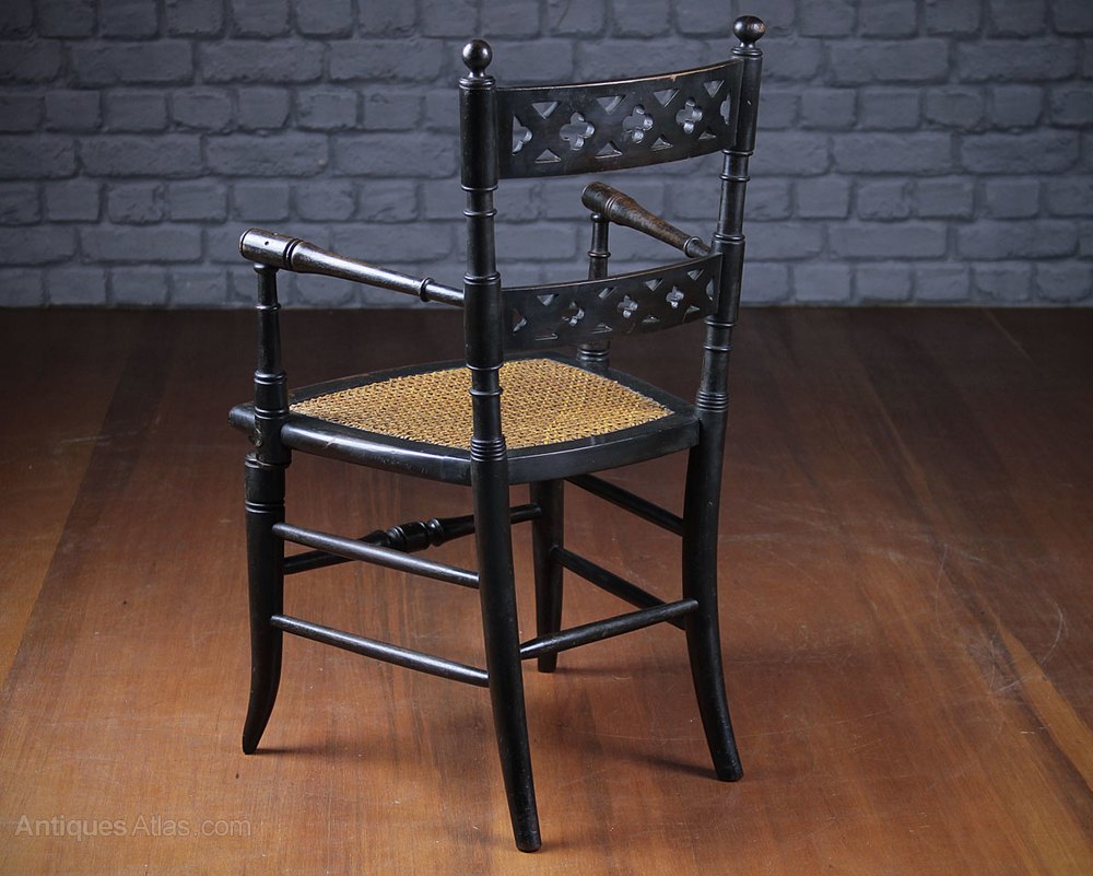 Unusual late 19th.c. Gothic style child’s armchair c.1880. Painted ebonised frame with turned and carved detail and quatrefoil pierced back stretchers over a canework seat. Missing a small piece from the front right foot otherwise very good condition cleaned and waxed in our workshops.