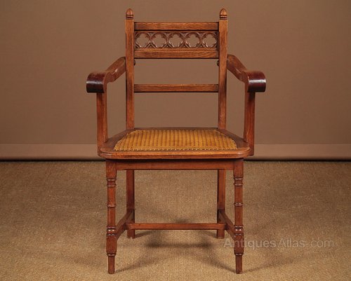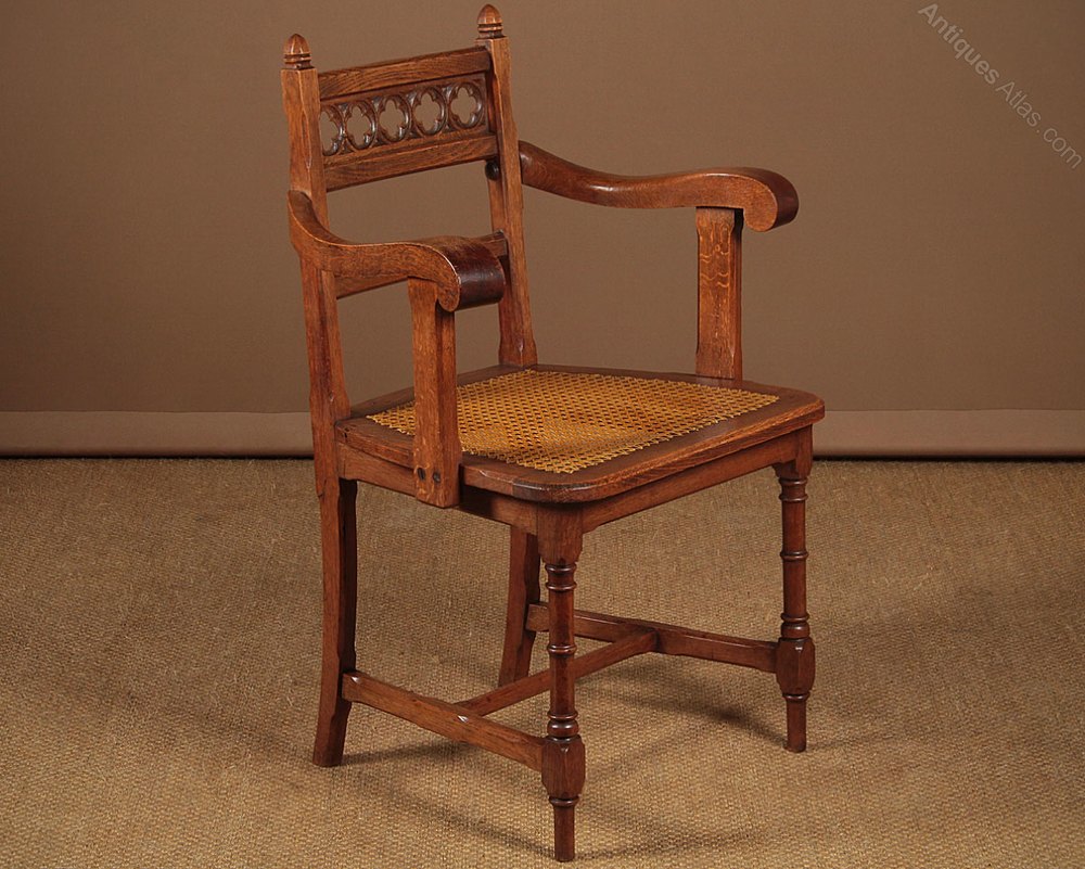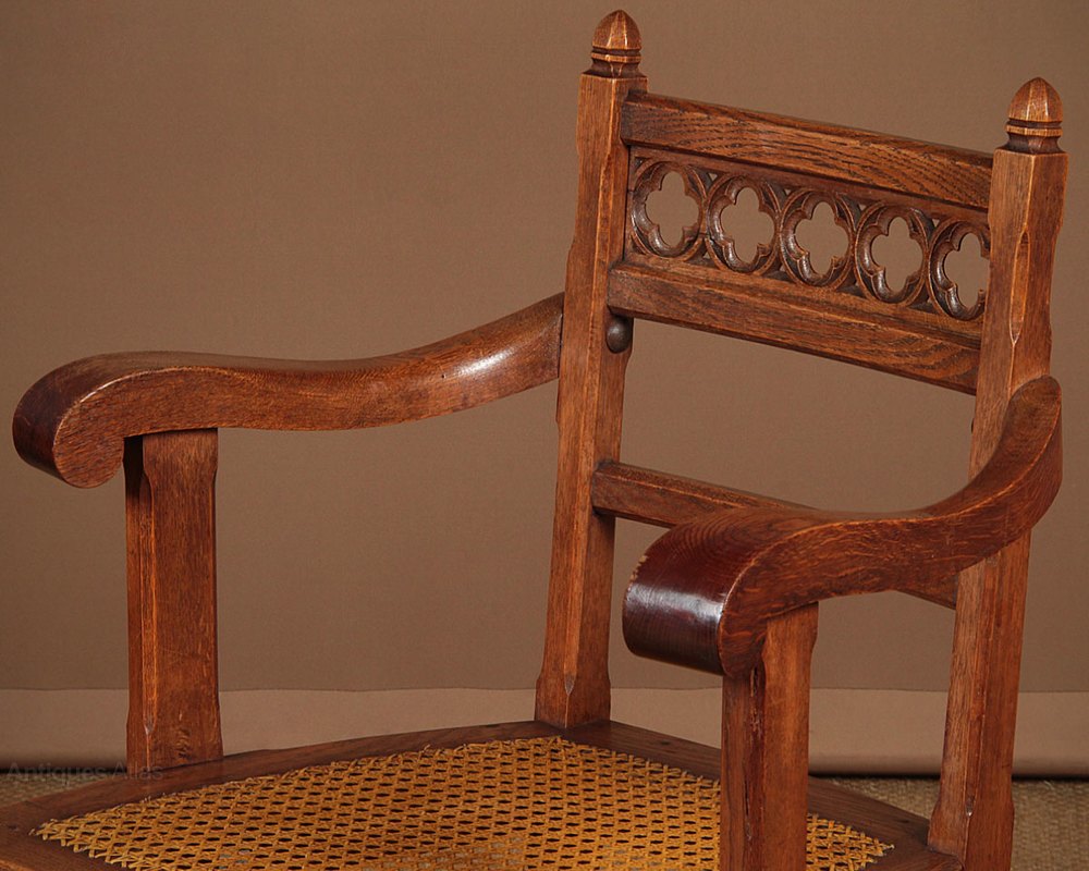 Unusual little late 19th.c. Gothic oak desk chair c.1890. Decorative backrest with pierced quatrefoil tracery detail and octagonal section finials. Broad shaped arms on chamfered supports over a canework seat. Turned front legs with chamfered H stretchers. Excellent colour and condition, cleaned and waxed in our workshops.