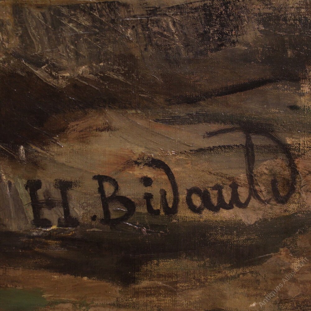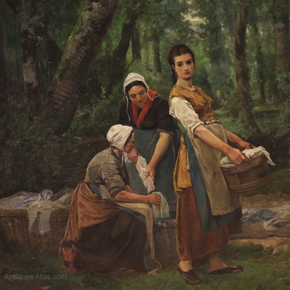 Fabulous French painting from the second half of the 19th century. Oil painting on canvas, first canvas fixed on a wooden panel, depicting a popular subject, Laundresses at the river. Typical representation of the realist current where workers are depicted in real contexts, the artists in fact wanted to free themselves from bourgeois taste and academic subjects. Furthermore, there is no attempt to dignify their effort, they are concrete men and women. Artwork of exceptional size, ideal for placing in a large living room or studio, for antique dealers and interior decorators. 20th century carved and gilded wooden frame that has undergone a restoration with resumption of the gilding in some points (see photo). Painting of great pictorial quality, the color contrast with the wooded background and the characters in the foreground is amazing. Artwork signed H. Bidauld on the bottom right (see photo) attributable to the French painter Henri Bidauld (1839-1898), lacking authentication. Monumental painting, probably born to be presented in an important art exhibition during the second half of the 19th century. Framework that has undergone a conservative restoration with application on a wooden panel to facilitate the drafting of the canvas during the 20th century. In good condition, with some signs of the time. Sight size H 160 W 250 cm