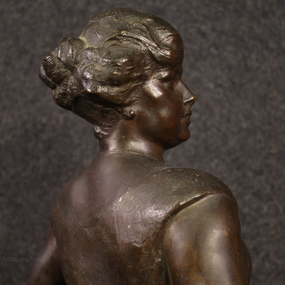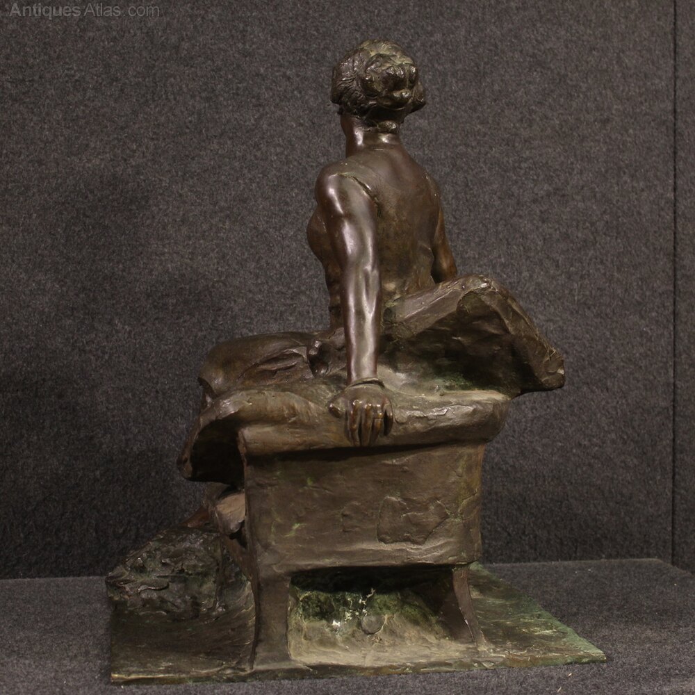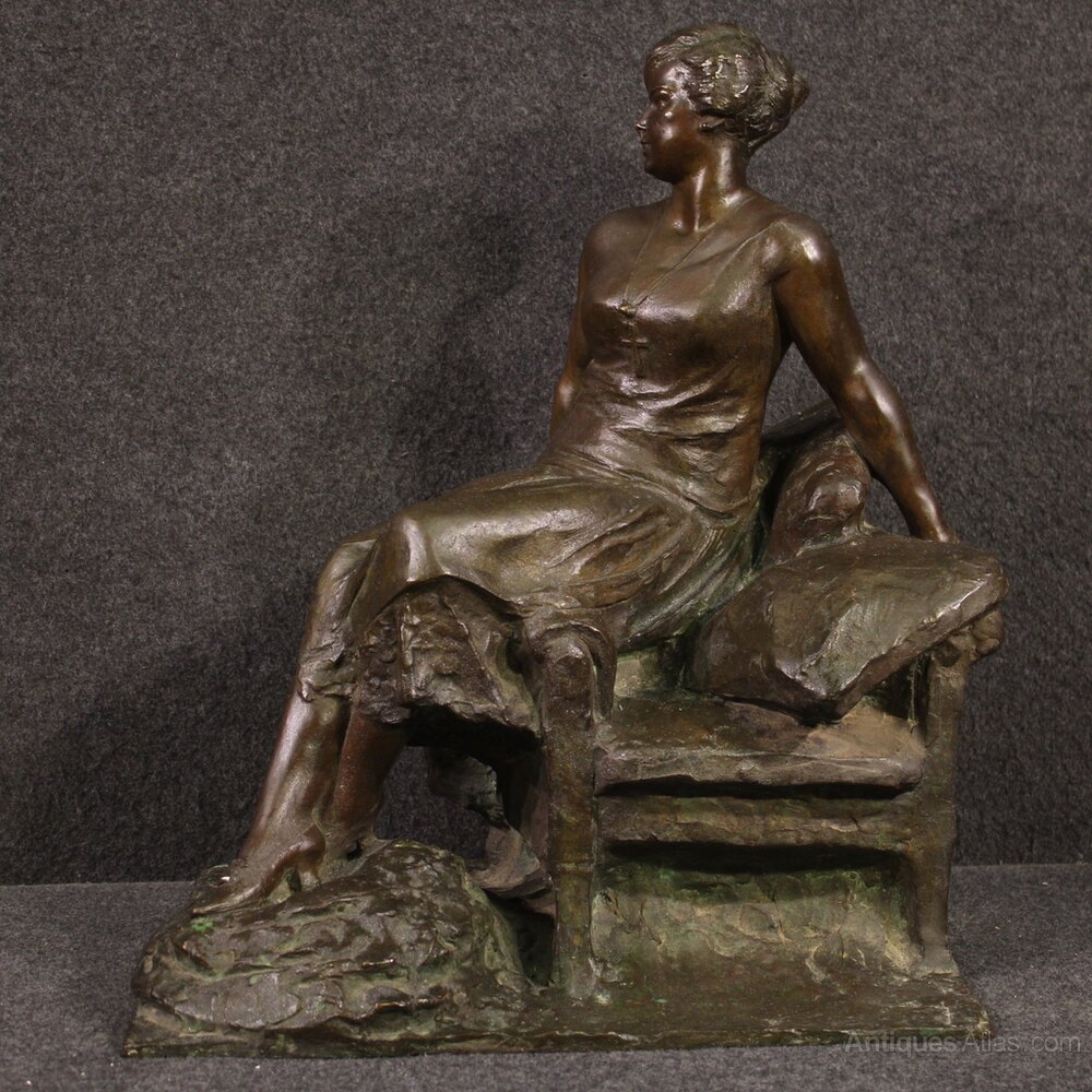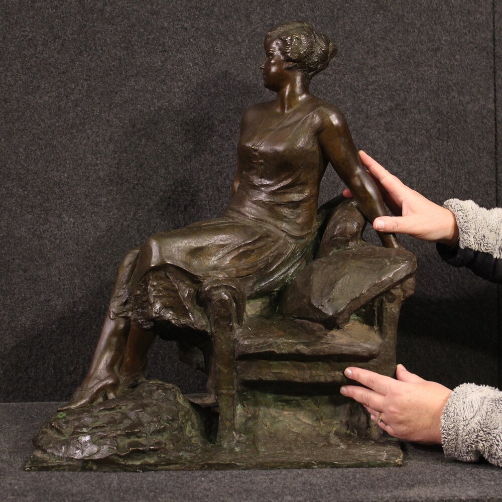 Italian sculpture dated 4 June 1925. Finely chiselled and patinated bronze work depicting a female figure entitled Treccia Rossa. Lady posing sitting on a sofa, sculpture with a typical and pleasant taste of the 1920s. Work signed and dated on the base (see photo) referable to the famous sculptor Pier Enrico Astorri (1882-1926), lacking authenticity, for antique dealers and bronze collectors Italians of the early twentieth century. Excellent quality centre-finished bronze, ideal for placing in a living room or living room. Of beautiful size and proportion, it presents a patina and is in a good state of conservation.