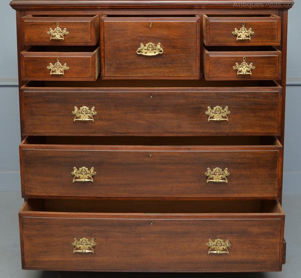 This very handsome chest gives a vast amount of storage space. Having eight drawers in total. The three lower drawers graduate in size. The five drawers to the top feature a central "hat" drawer, flanked by four further small drawers. All drawers are strong and sturdy and constructed from solid mahogany, which shows great quality. The drawers open and close easily and smoothly.