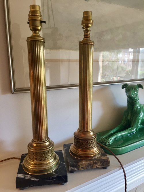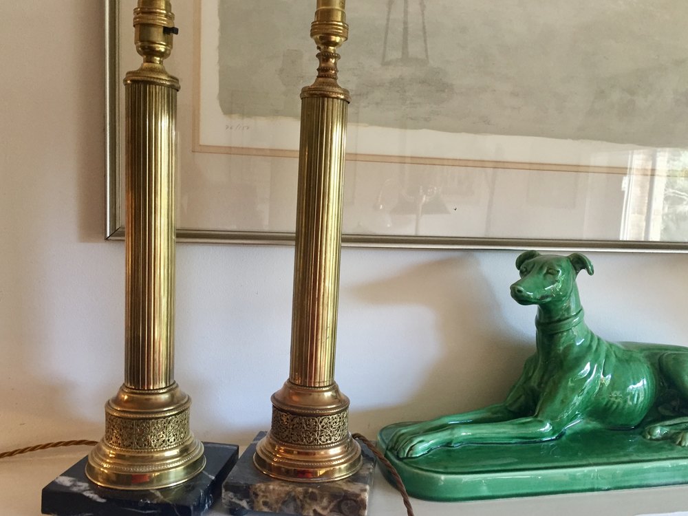 A very handsome near pair of French obelisk table lamps in brass set on square granite base.