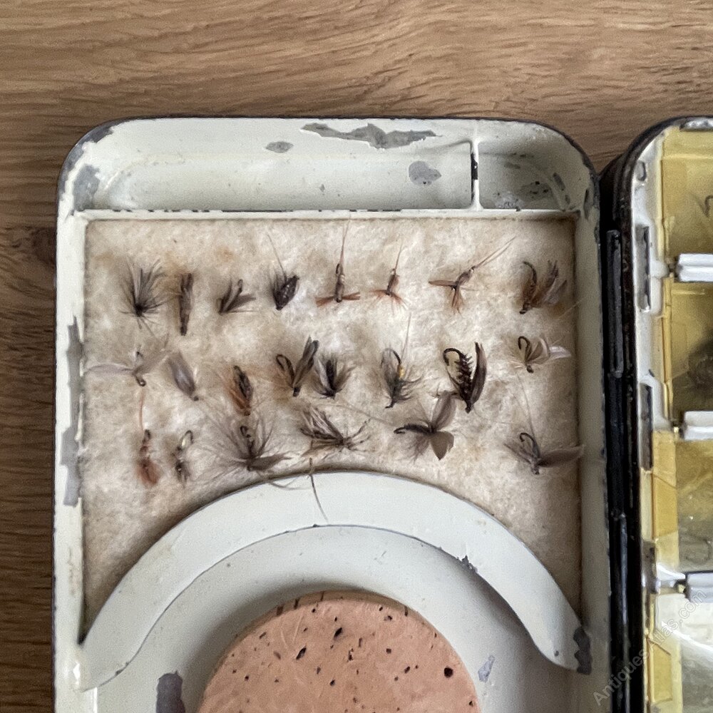 The clever design of this early dry fly box features several areas to store fishing flies. The top left of the case is fitted with cream felt that makes access to frequently used flies easy. The bottom left has a circular shaped compartment for storing fishing wire. In the centre is a small cork platform that provides fast access to favourite flies.