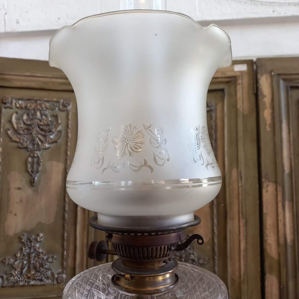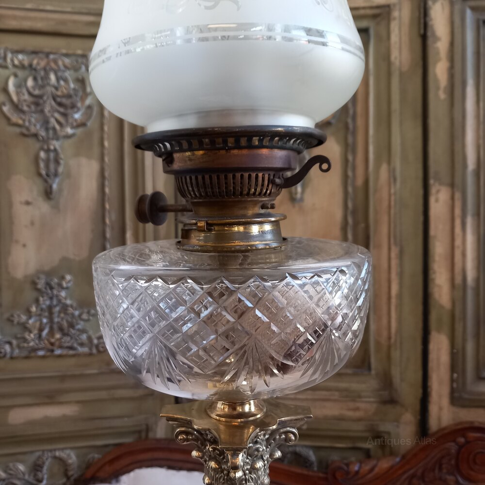 A quality Victorian oil lamp retailed by Harrods of London. A beautiful Victorian Corinthian column oil lamp with a cut glass font.