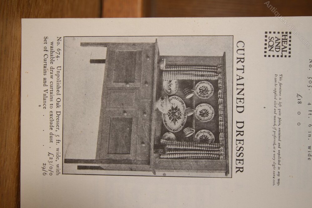 A wonderful, so original Heals of London antique solid oak kitchen dresser, made in two parts. The top plate rack display section has a dentil moulded cornice with a central oak plate shelf that has lovely, well turned oak pegs for hanging cups and mugs. This Heals antique dresser base stands on square legs and has two long drawers over two oak cupboard doors, they all have the original oak knob handles. In superb condition throughout, listed in the original Heals catalogue. Dates to 1915-20.
