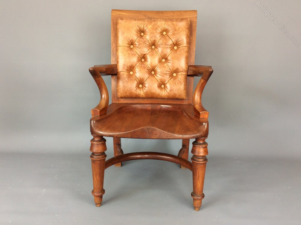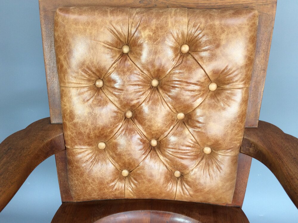 Late 19th century mahogany desk chair or library armchair by Heal's of London c1884, having a newly upholstered leather padded deep buttoned backrest enclosed in a solid mahogany frame. The chair is well crafted, with generous proportions and unusual serpentine shaped arms over a deep saddle seat. It stands on baluster turned legs, outswept back legs and crinoline stretcher.