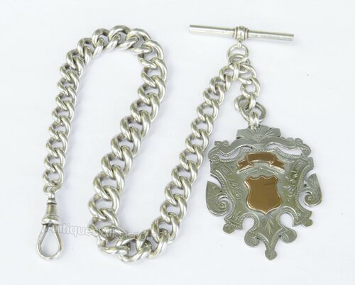 The chain comes with an impressive heavy fob, 38mm wide, 46mm high. The front has rose gold wash detail, there is a 4mm scratch to the shield but not too detrimental. The fob was awarded in 1904 and there is a brief engraving to the reverse.