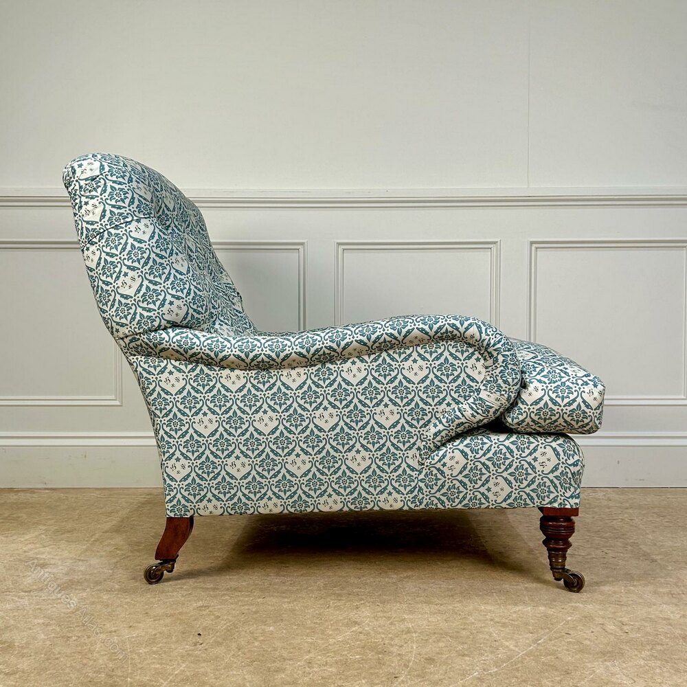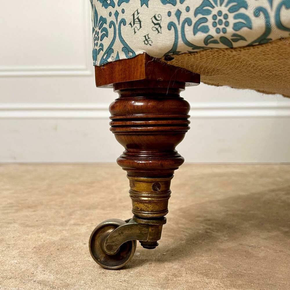 A wonderful Howard & Sons Grafton armchair. This beautiful chair retains the original horsehair and down feather cushion. Raised on walnut turned legs with the original stampled gilt lacquered brass castors. The back leg stamped Howard & Sons Ltd, Berners Street. A super original example. Re-upholstered in H&S monogrammed ticking. English, Circa 1910.