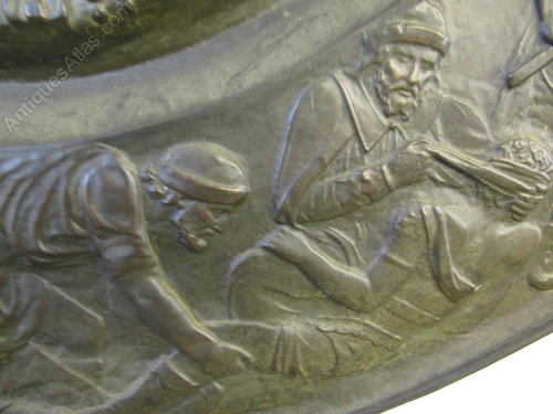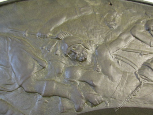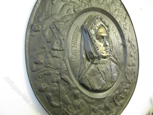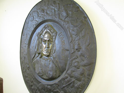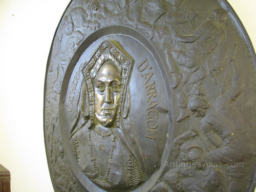 Late 19thc French Repousse brass Catherine of Aragon portrait plaque.The plaque measures A huge 38''diameter and depicts Catherine of Aragon,with a battle scene around the edge.Made from brass with signs of old repairs and some denting,still displays well.