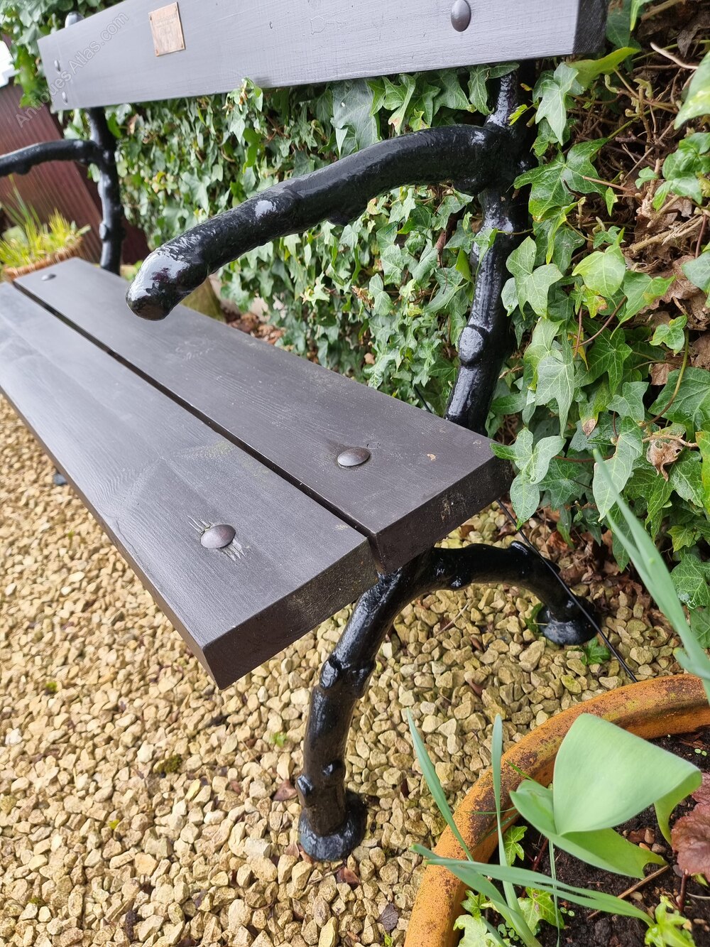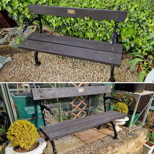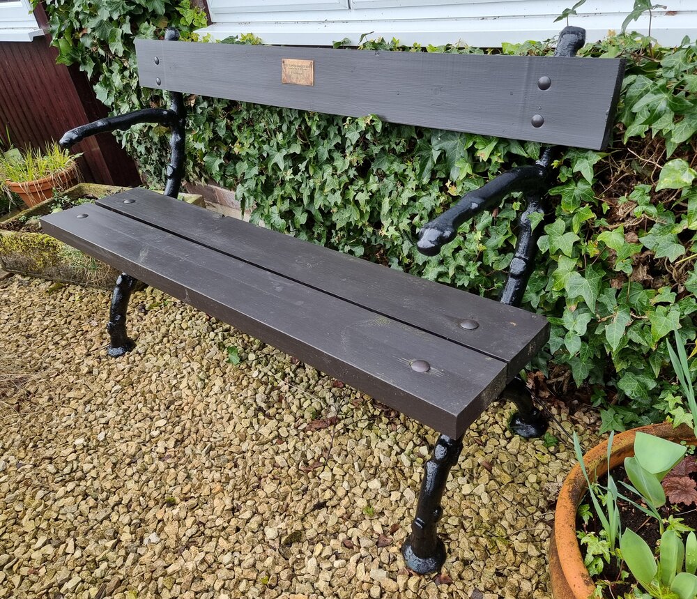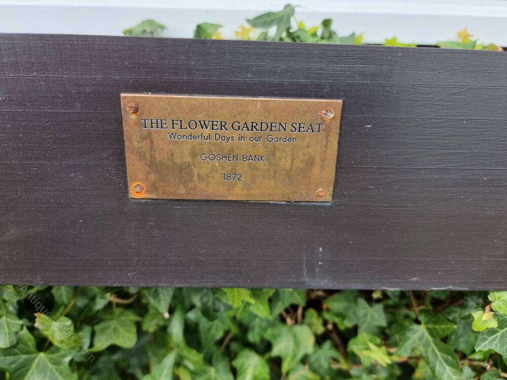 We have four of these identical benches, also available to purchase separately. They each have a brass plaque with different wording.