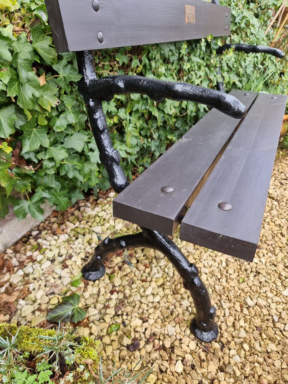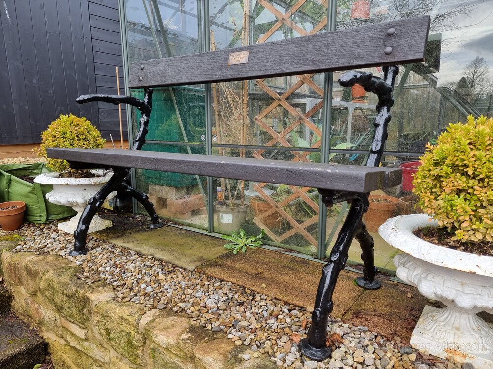 Quality PAIR of 19th Century cast-iron and wood garden benches, both in excellent condition. Complete with romantic brass plaque to each bench (please read). Fully refurbished with new wood and four coats of stain and protection. Delivery available.