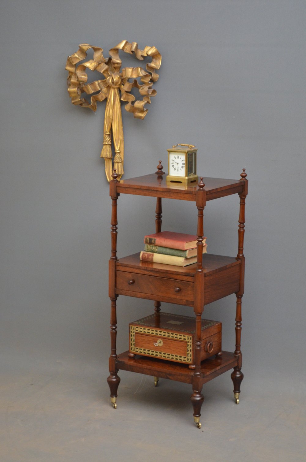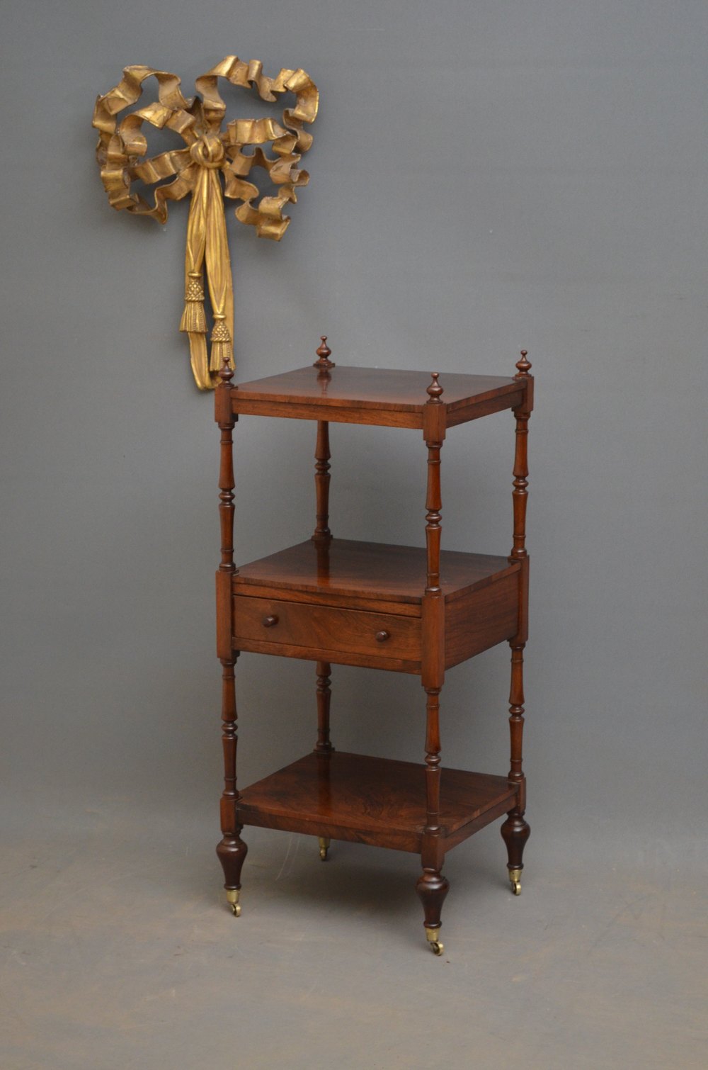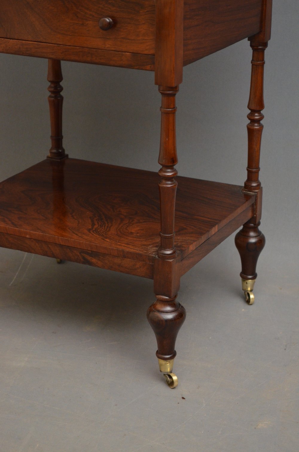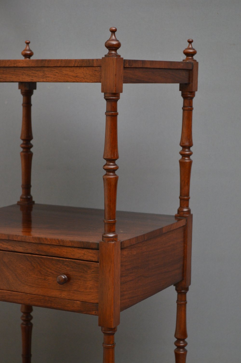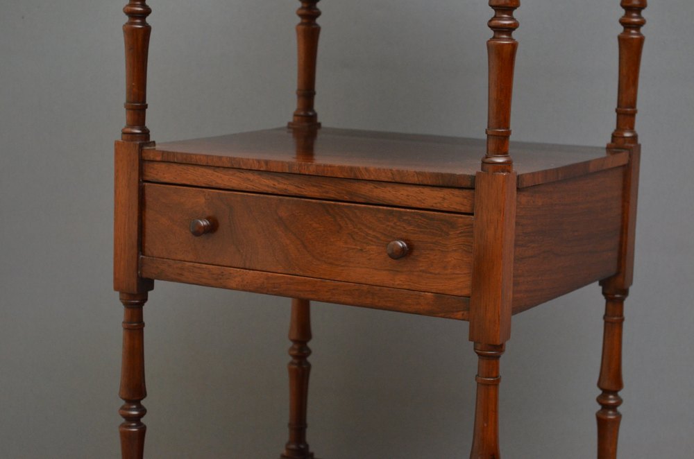 Sn3647 Immaculate George IV rosewood étagère, having 3 figured rosewood tiers with turned finials, slender supports and oak lined drawer fitted with original turned knobs, all standing on tulip shaped legs terminating in original brass castors. This fine Georgian whatnot is in wonderful original condition throughout, ready to place at home. c1830